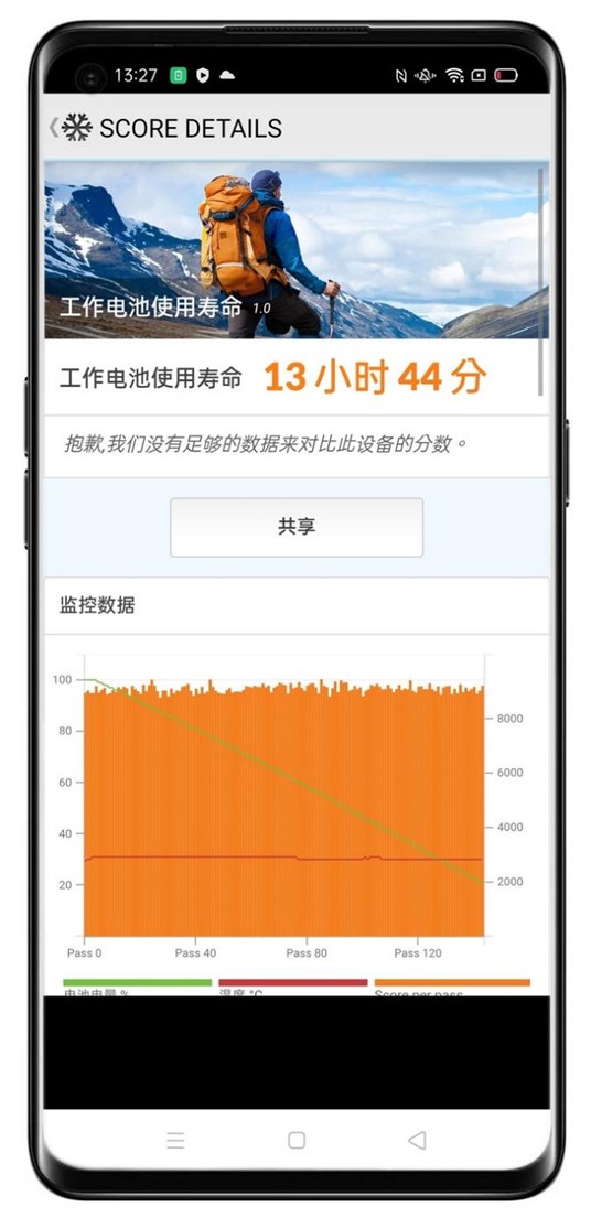 阿輝實際測試 Reno4 Pro 內建了等效於 4000mAh 的大容量電池,實測電力部分以 PCMARK 做標準測試,測試 80% ~ 20% 間的電力運行,模擬上網、工作、遊戲的混合應用,測試結果為 13 小時 44 分鐘,測試方式與標準可以參考這篇說明。