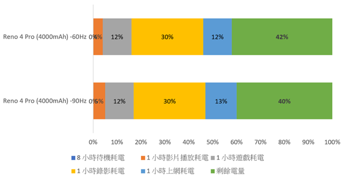 - Reno4 Pro 瀏覽器連續讀取瀏覽 1 小時,實際消耗 12% 電量,剩餘 42% 電量