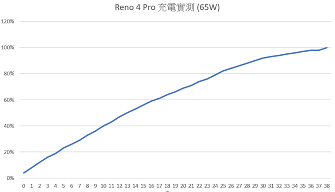 OPPO Reno4 Pro 充電部份超威武啊!直接就是支援過去旗艦機才有的 SuperVOOC 超級閃充技術,這裡我們將機器消耗到自動關機,接上原廠充電器與原廠線材開機充電(待機狀態),並觀察紀錄充電實際的速度與時間,不過因為台灣是 110V 電壓的緣故,OPPO Reno4 Pro 的 65W 超級閃充在台灣使用 110V 使用時會被限制在 50W,阿輝實際測試監控最高峰值充電效能約在 48W,不過 OPPO Reno4 Pro 這充電速度還是非常快速,可以說就是目前台灣上市手機充電最快的梯次。