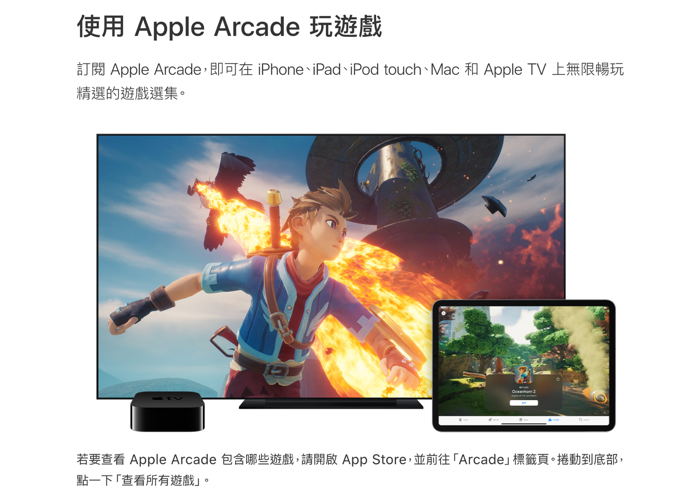 接著就是一個非常有意思的功能,Apple 家族可以透過 Arcade 包月功能來玩遊戲,玩好玩滿,不只是不用再重複考慮買一款、兩款付費遊戲是不是超過每個月可以動用的娛樂消費額度,只要每個月付固定的錢就好。