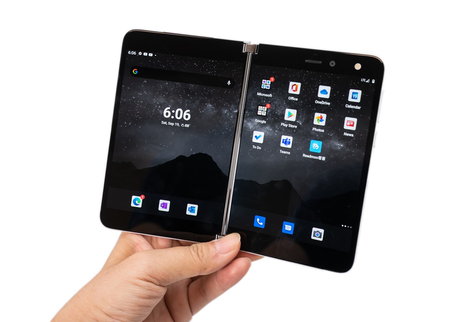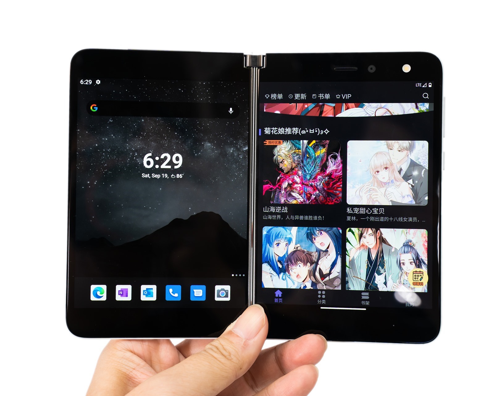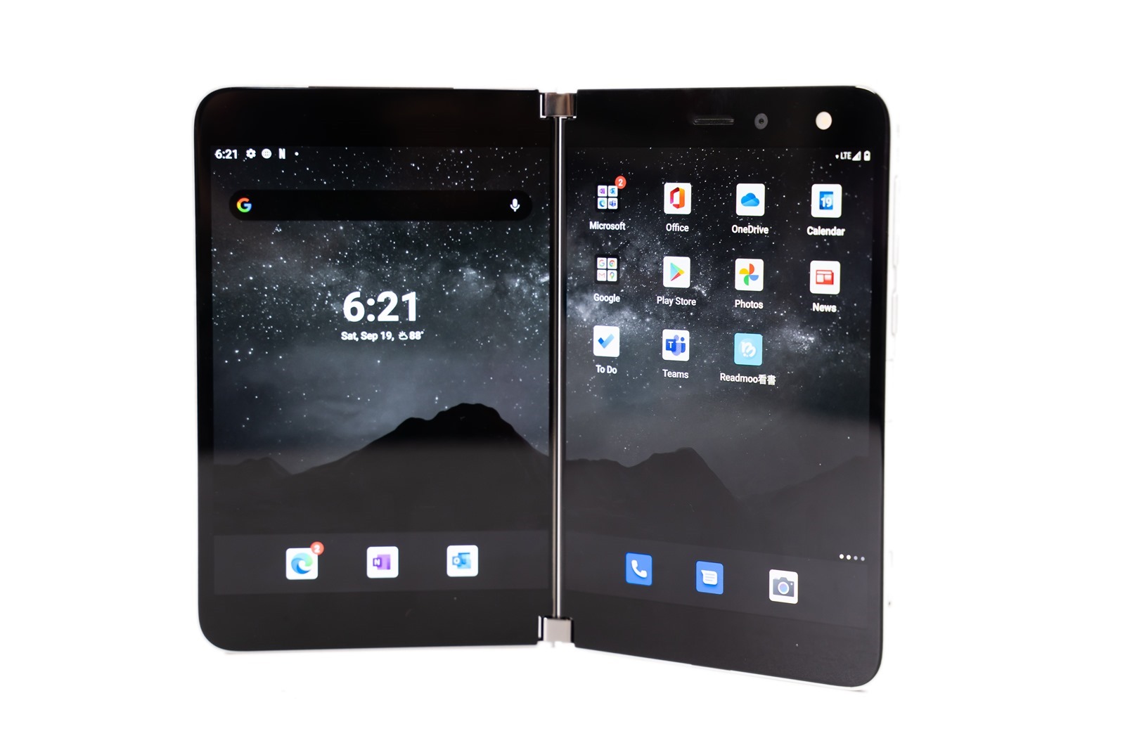 打開 Surface Duo 是兩片各 5.6 吋比例 3:2 的螢幕,也可以說兩片合計 8.1 吋的 3:2 大螢幕,其實這非常驚人幾乎就是 iPad Mini 平板般的螢幕大小了,但是因為 Surface Duo 可以折疊的設計,還是可以放入大部分的口袋中;xx 採用 Android10 系統,作業系統接近原生體驗,但除了有內建 Google 之外,也有內建 MS 自己推出的應用程式
