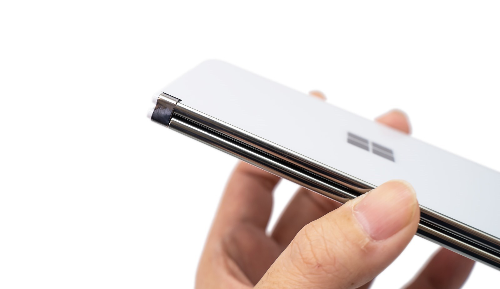 外型部份之外,Surface Duo 最重要的設計也就是可以 360 度翻折的鉸鍊轉軸結構,Surface Duo 使用的「雙軸鉸鏈」結構來自於自家 Surface 家族噁設計經驗,翻轉起來最大可達到 360 度並且手感穩定優異,不緊不鬆的絕佳手感甚至鉸鍊還可以讓螢幕在任意一個角度固定住