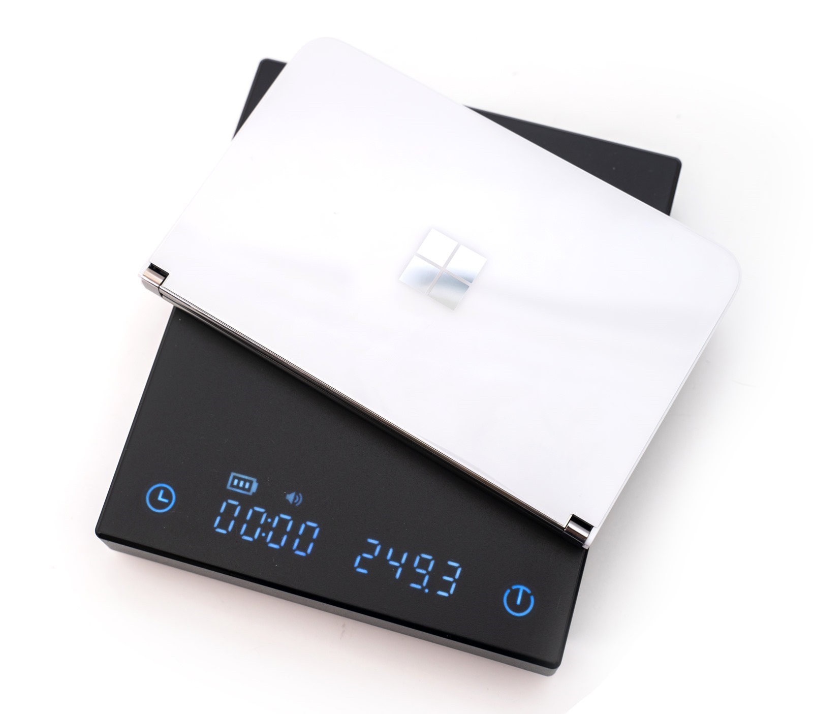 實測重量接近 250g 不過感受上卻沒有數字上的沈重,大概也是其實 Surface Duo 以螢幕大小/面積來說算是大手機,甚至攤開的螢幕大小幾乎就是 iPad Mini 的感覺,而這樣的重量則是『相對』會有感受比數字更輕的感覺