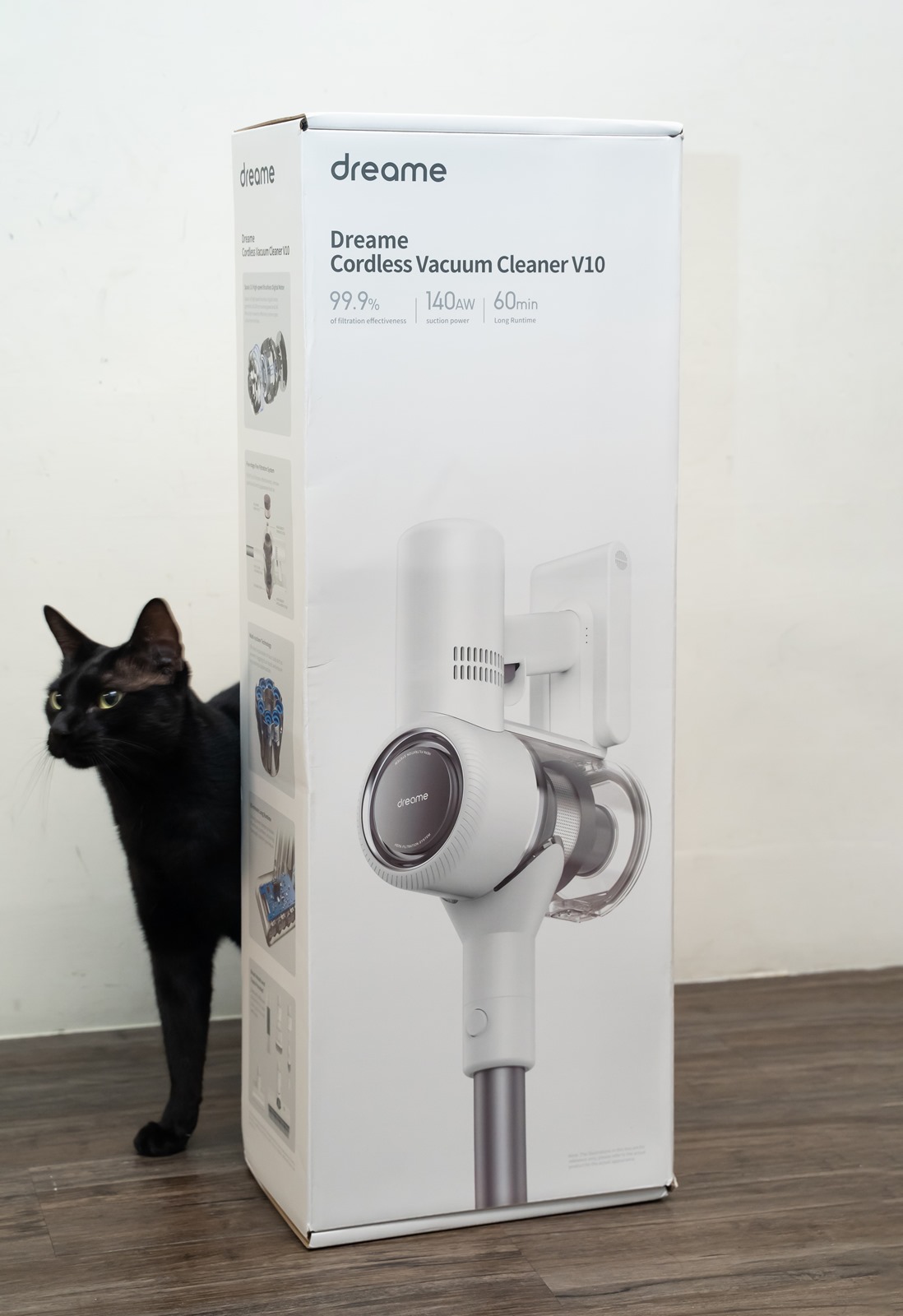 這幾年在家具、家電、家飾品吹起了一股白色風潮,不管是先前阿輝買過的純白衛生紙和延長線等等家用品,白色都是一種最恰到好處的顏色,dreame V10 的外箱配色也就已經是白色基調為主,也可以清楚的看到機體本身的設計也都是白/灰為主的設計,視覺感可以說是非常柔和。外箱側面則有 dreame V10 的機件結構介紹說明,這部份阿輝在後面的段落也會有進一步的介紹給大家。