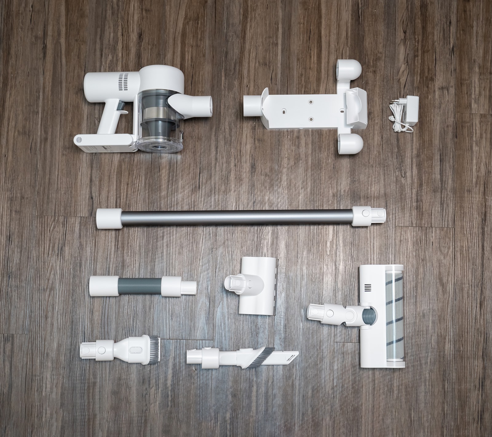 dreame V10 的包裝內容物共有一個主機、 4 隻刷頭,其中包含一隻電動除螨拍打刷頭、一隻金屬連接桿、一隻延伸軟管、還有一個變壓器與充電收納二合一架,共 9 樣東西在裡頭,整體配色是由白灰搭配,不管你家裡的設計是工業風、鄉村風或是北歐風,dreame V10 的外型都是相當適合選搭的家電配件。