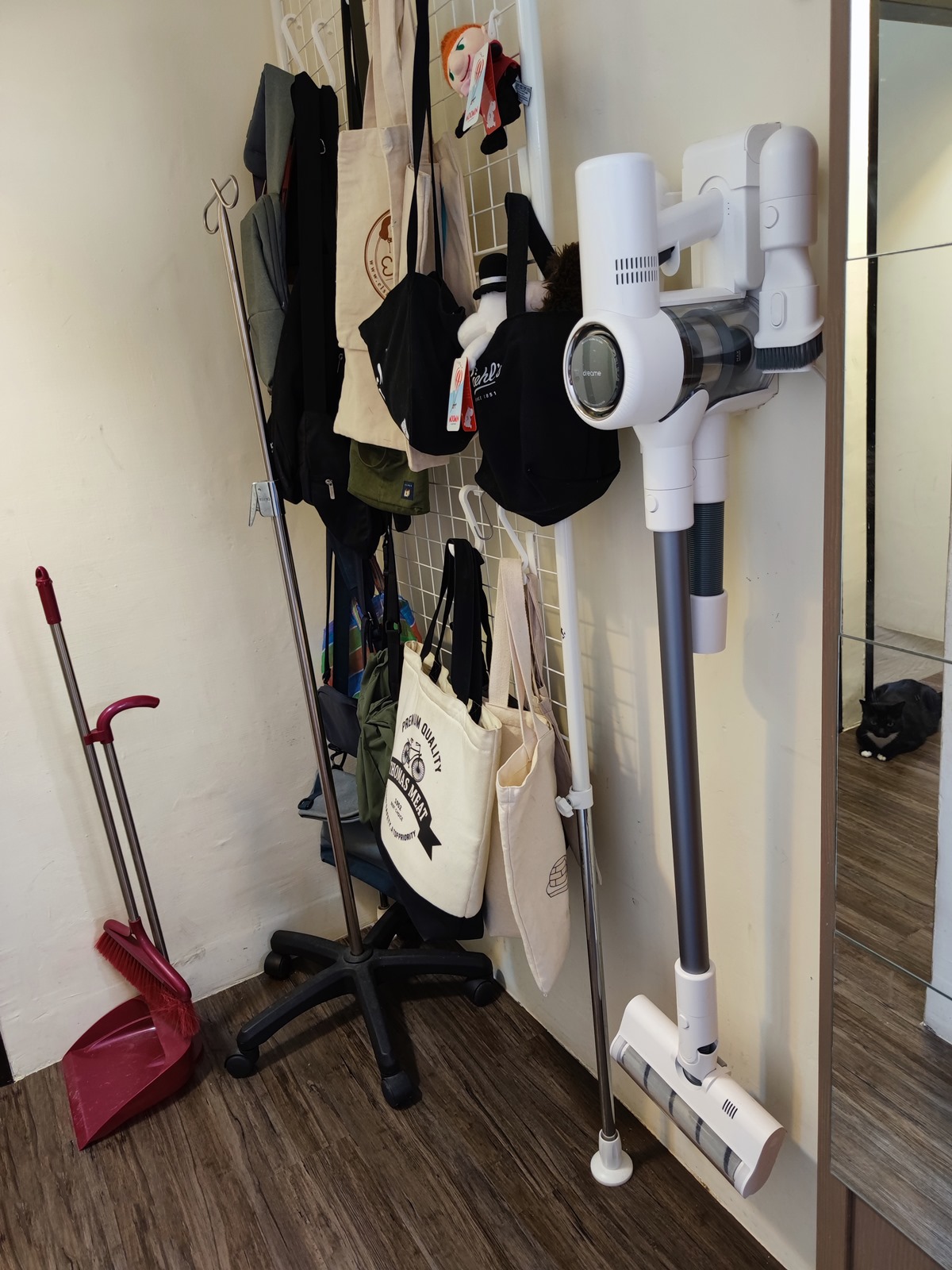 組裝起來的整體外型,dreame V10 這一次白色為主的配色不得不說阿輝是越看越喜歡,尤其是連刷頭的配色都和機身有非常好的整體設計感,每天看著它就漸漸的多幾分喜歡。