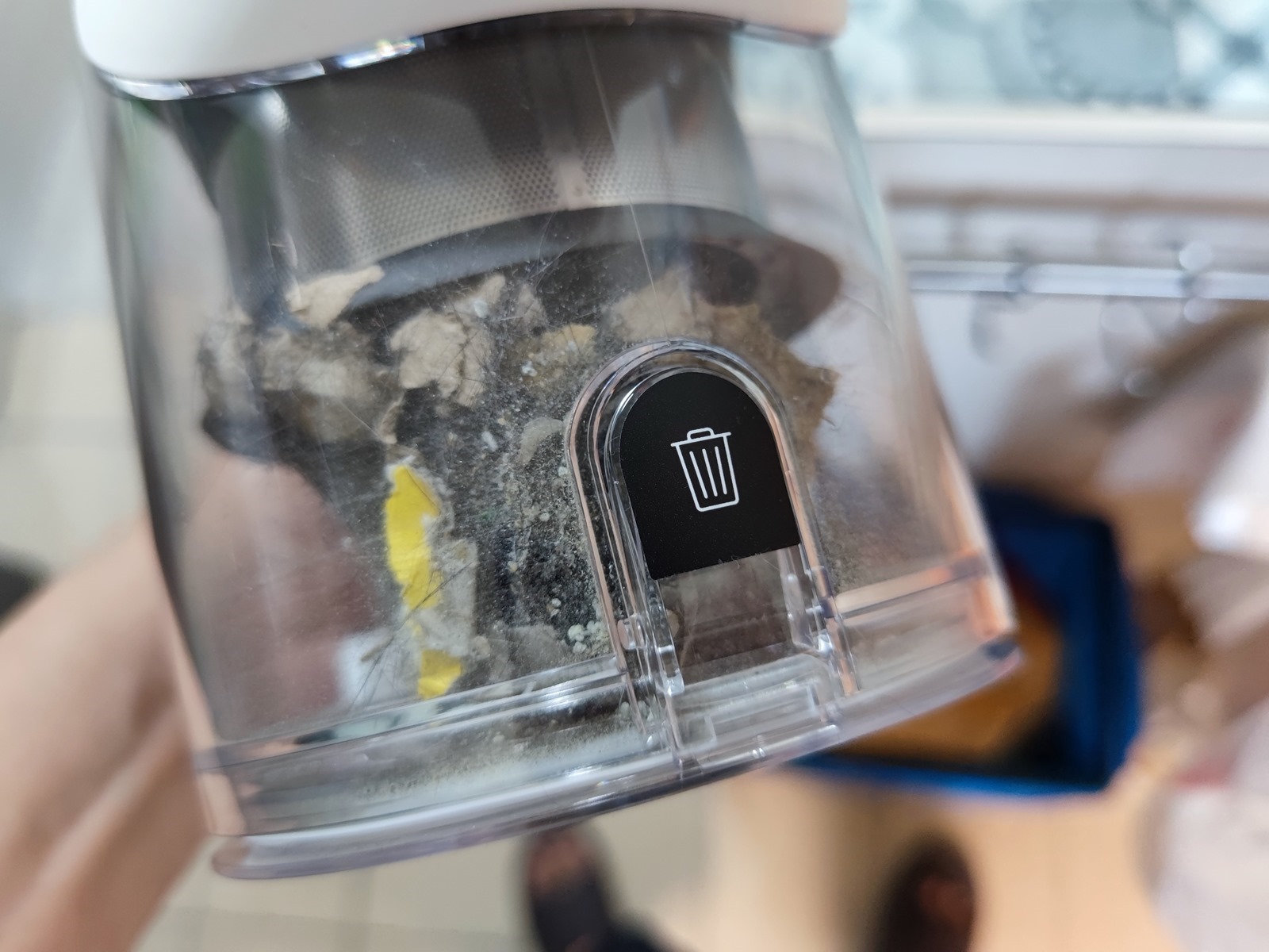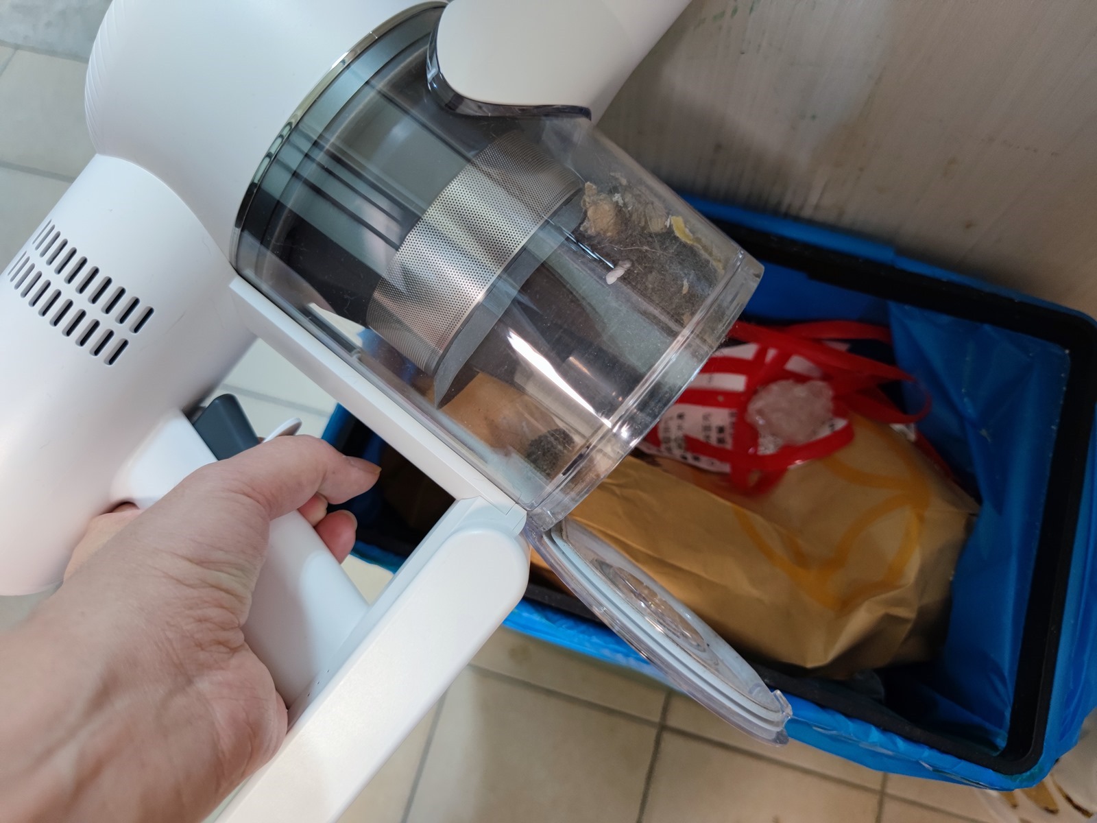 只要按下打開按鈕就可以直接打開集塵盒的外蓋,然後將吸起來灰塵、垃圾倒出,不僅不會讓灰塵噴的到處都是,也不必特別觸碰到有灰塵的機身結構。