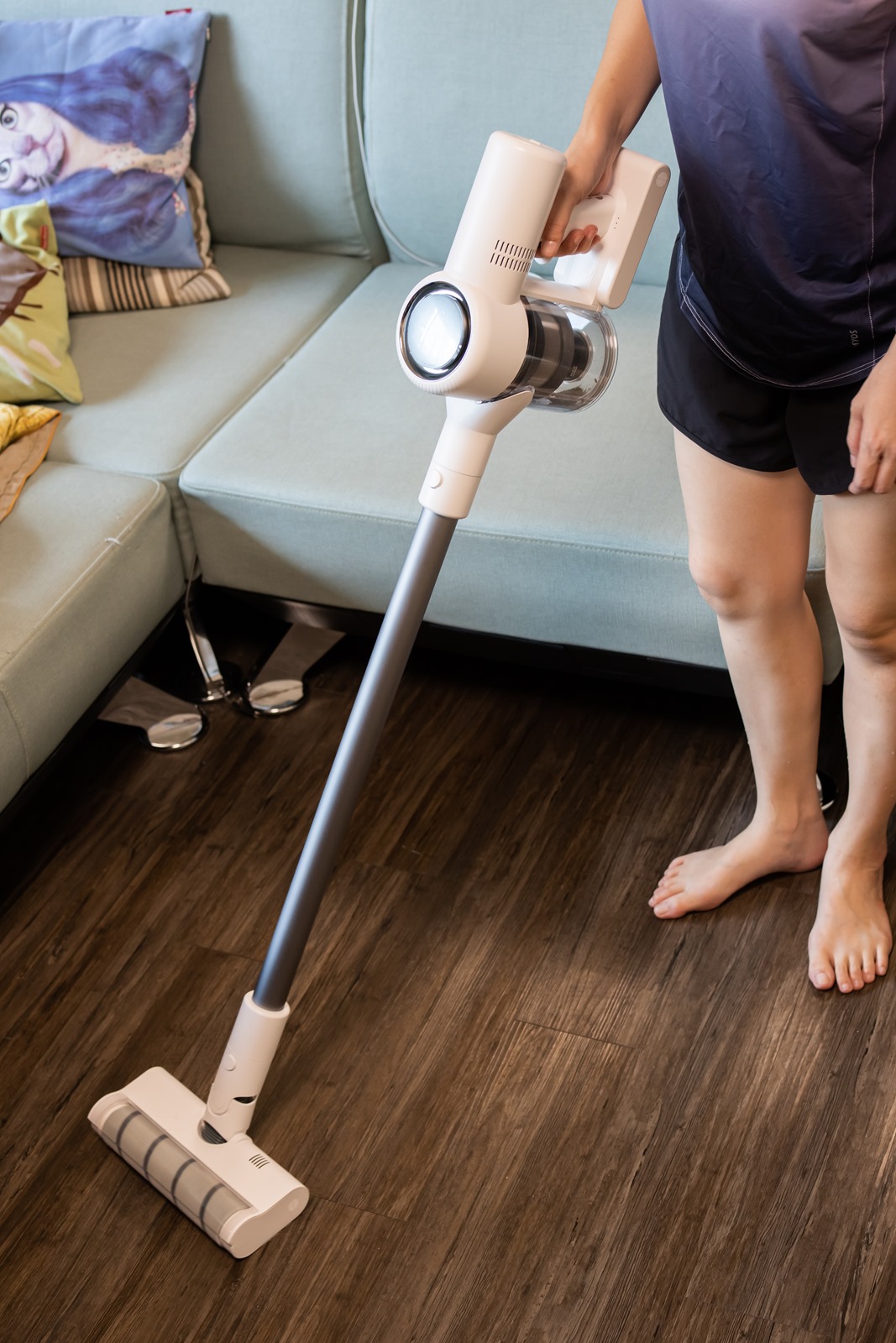 搭配金屬連接桿,平時想要隨取隨吸都很方便,要說 dreame V10 輕巧的機身與大角度幾乎無使用限制的情境,深入沙發底下的清潔也可輕鬆完成,接近水平狀態也不影響吸力。