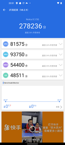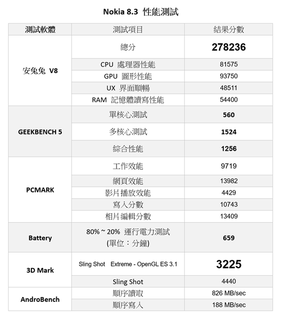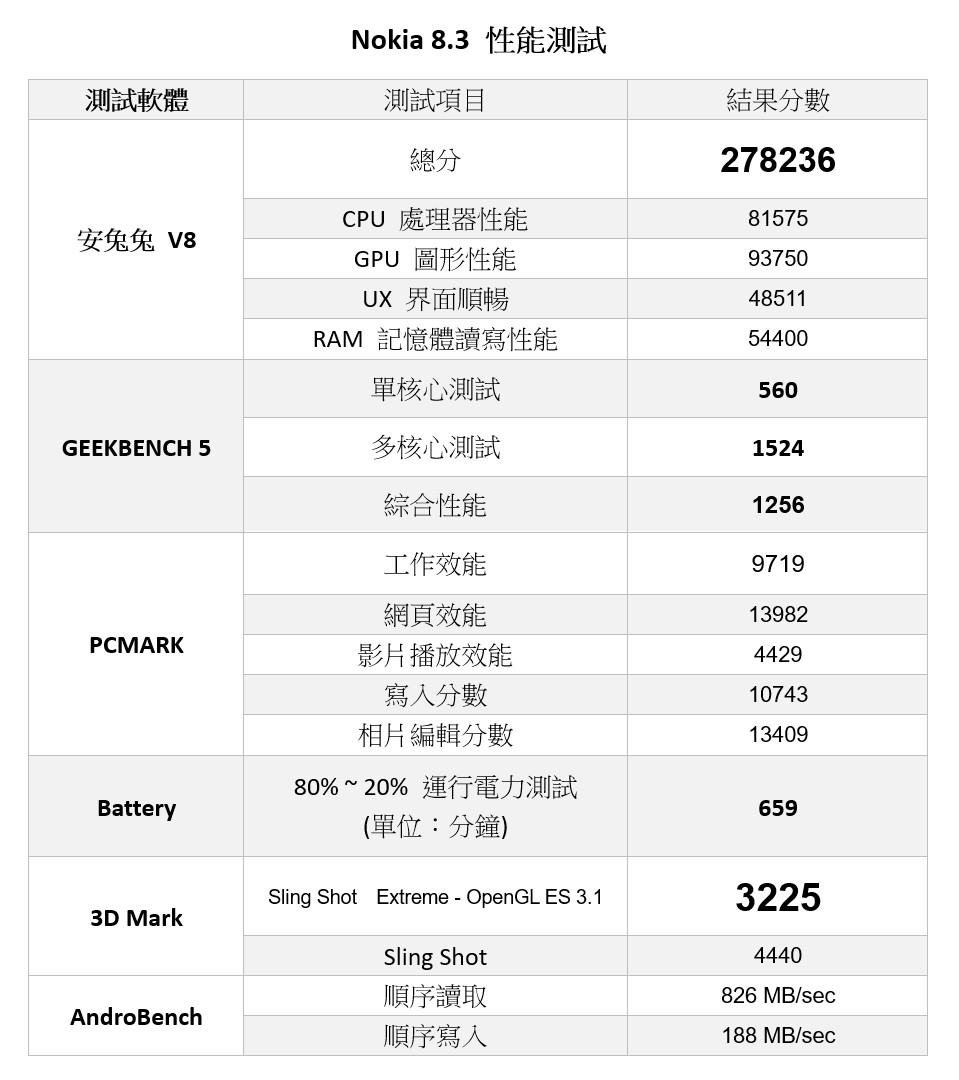 Nokia 8.3 採用高通 Snapdragon™ 765G 處理器與 8GB 內建記憶體的規格配置,更多資料也可以阿輝資料庫 https://reurl.cc/MxdjK ,資料庫中包含超過 350 支以上阿輝多年測試的實測數據,可以給大家作為對照參考使用。