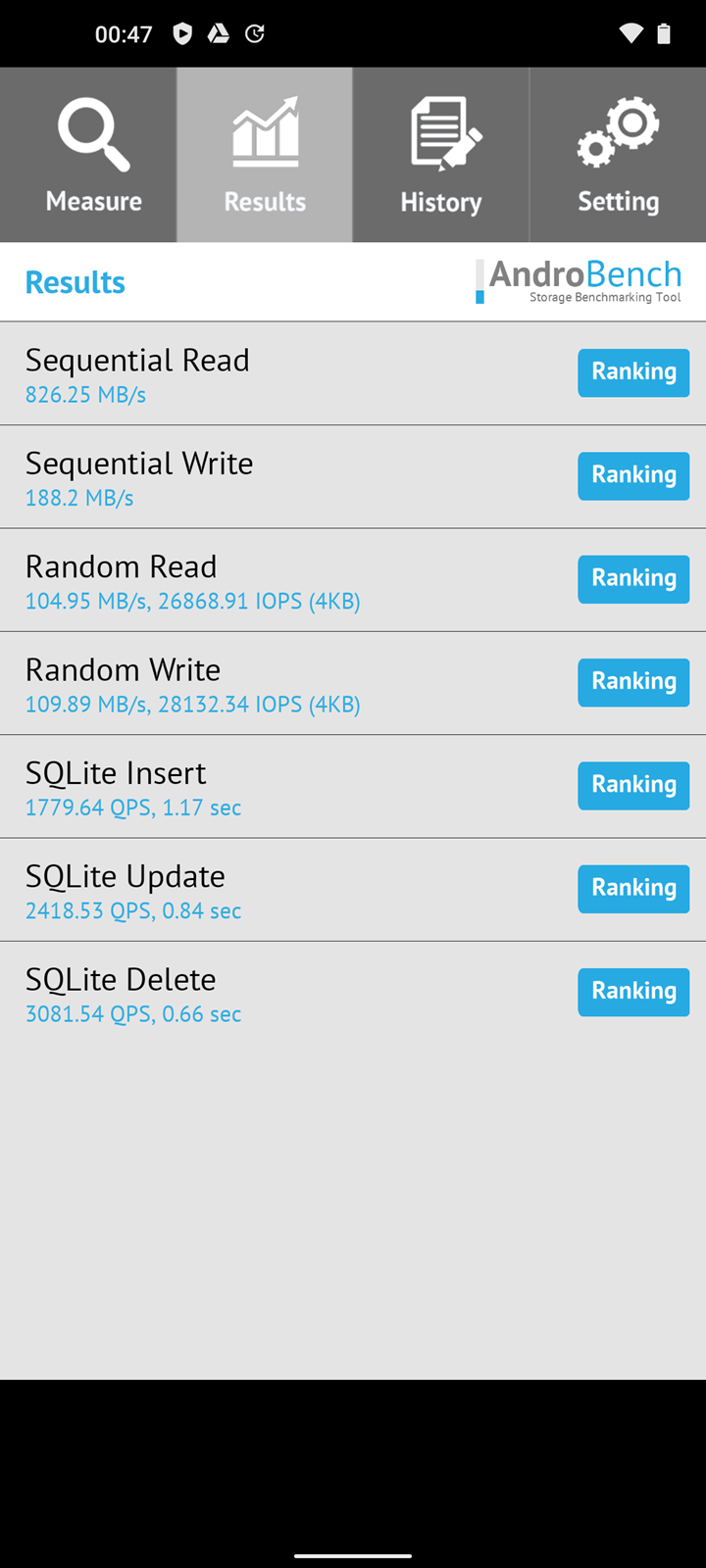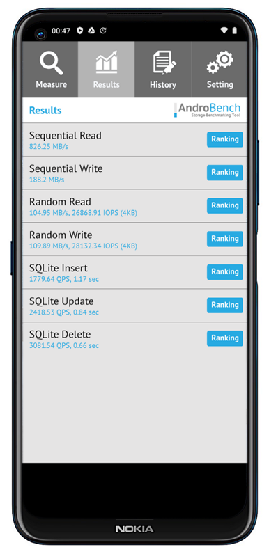 其實除了 CPU 處理器與記憶體,內建儲存空間的讀取/寫入速度也非常影響到日常使用的順暢度,這裡使用 AndroBench 實測讀寫速度,測得的結果為讀取 826 MB/sec MB,寫入為 188 MB/sec