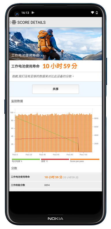 阿輝實際測試 Nokia 8.3 內建電池容量為 4500 mAh,實測電力部分以 PCMARK 做標準測試,測試 80% ~ 20% 間的電力運行,模擬上網、工作、遊戲的混合應用,測試結果為 10 小時 59 分鐘,測試方式與標準可以參考這篇說明。