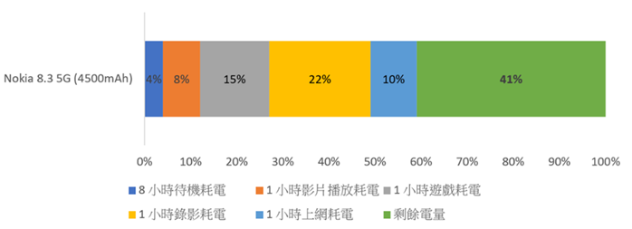 - Nokia 8.3 手機待機 8 小時測試,實測消耗 4% 電量,剩餘 96% 電量