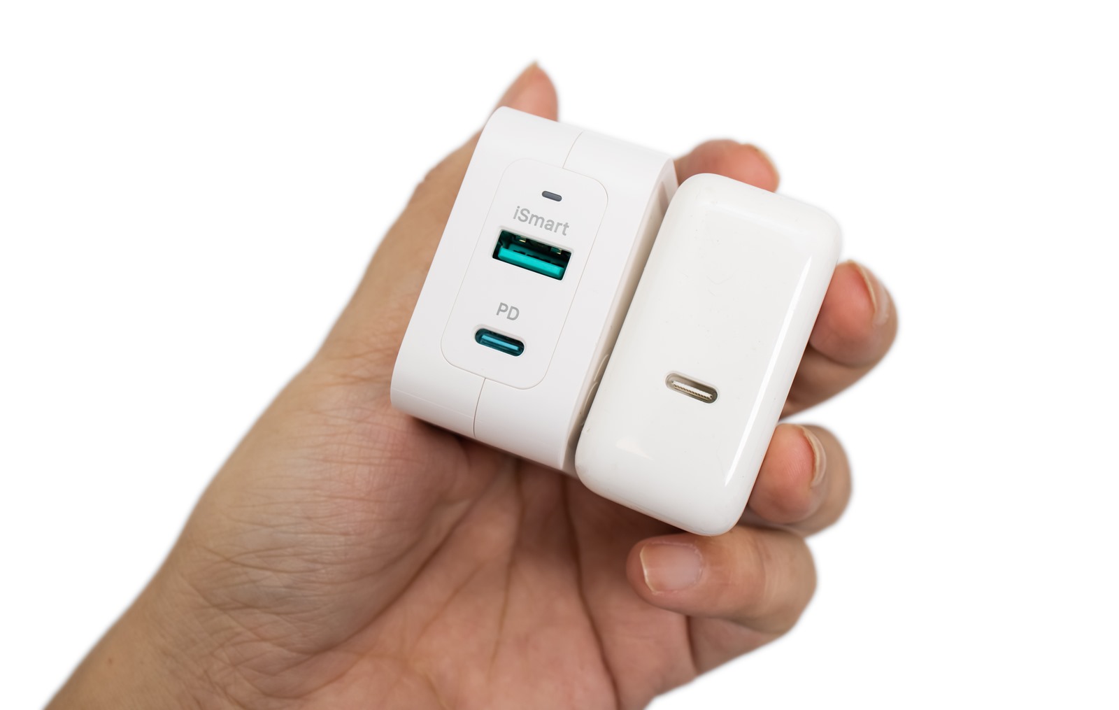 兩款都不只比一般充電器更小,也更輕巧,放在家中使用也可以跟其他電器插頭一起使用,不會像某些品牌一樣屁股比阿珠馬還大,會讓延長線本來四個孔洞只剩兩個,帶出來使用時又小又輕又方便,90W 只有 195 克,即使每天帶在身上都不會造成任何額外負擔。