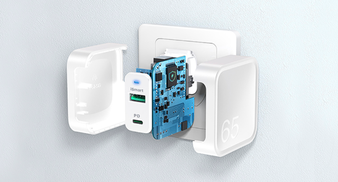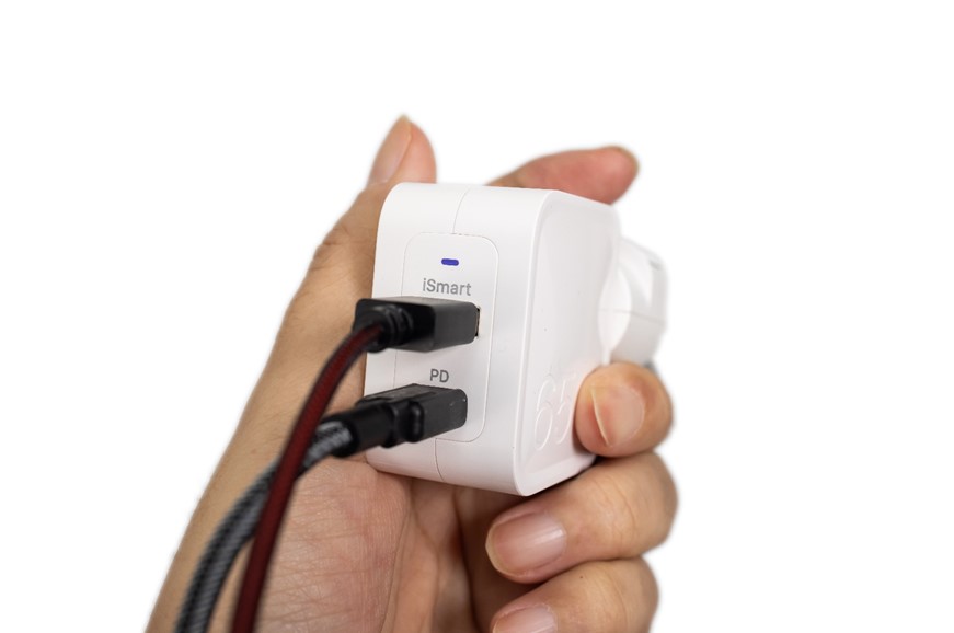 智慧分流技術可以支援筆電和手機同時快充,更省充電時間,還有自動識別裝置會判斷所需輸出的電流,在雙孔同步使用快充或是單孔只用的情況都自動調整,不會傷及電池。