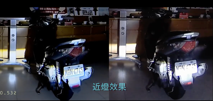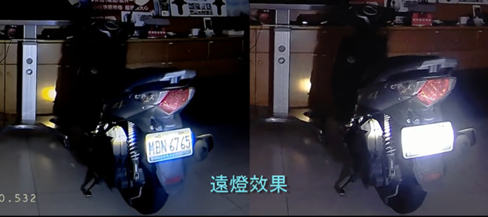 而且比起他牌行車記錄器,PX 大通機車記錄器不只可以安裝後鏡頭、有 HDR 高動態錄影,抑制強光的技術與調校可以有效壓抑 LED 燈強光,不管後方車輛打遠燈或是近燈,車牌都不會過曝。 (左邊圖是大通,右邊圖是他牌,畫面截取自官方影片)
