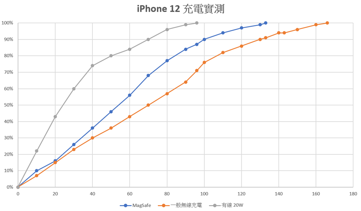 感謝 Tim 哥和 Tim 哥好朋友,阿輝也提前入手了台灣尚未上市的 Apple 原廠 MagSafe 磁吸無線充電器,這一次 MagSafe 無線充電器給 iPhone 12 系列手機的無線充電規格從過去的 7.5W 提昇到了 15W,並且阿輝也一併入手了原廠的 20W 快充充電器,就也來一起測試充電實測速度給大家參考吧!測試方式都是消耗到機器電量 0% 自動關機,開始充電後每 10 分鐘紀錄一次電力狀態,並繪製曲線圖給大家參考。