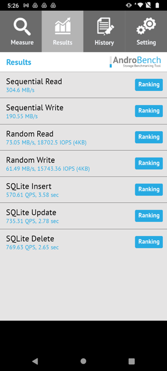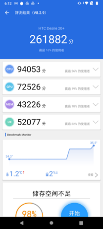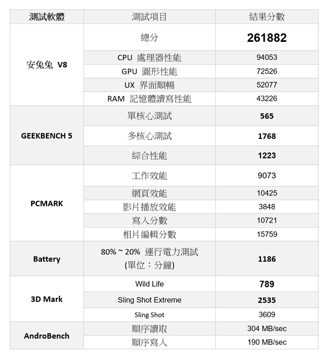 其實除了 CPU 處理器與記憶體,內建儲存空間的讀取/寫入速度也非常影響到日常使用的順暢度,這裡使用 AndroBench 實測讀寫速度,測得的結果為讀取 304 MB/sec MB,寫入為 190 MB/sec,其實真的要說 HTC Desire 20+ 的 CPU 性能其實和 S765G 實測出來蠻接近的,但是內建儲存空間速度實在是有點慢,相對於旗艦機會有日常操作會比較鈍一點的感覺。