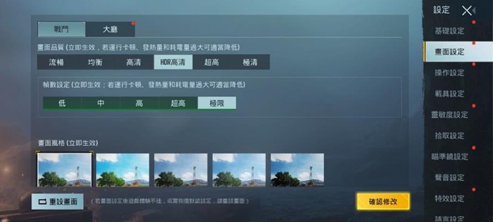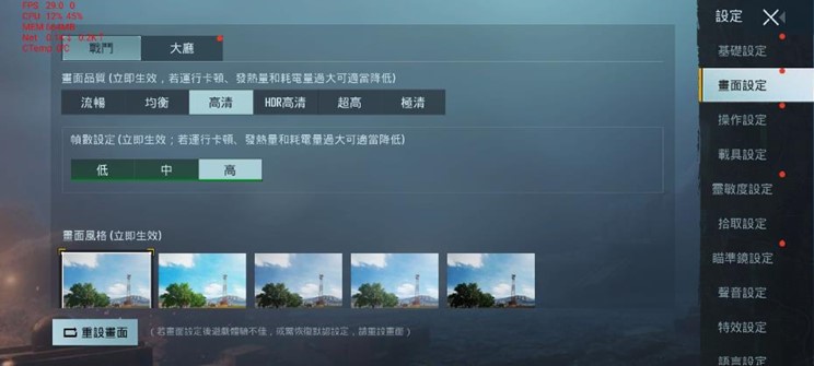 說到遊戲絕對少不了熱門的吃雞遊戲,我們看一下預設的設定可能是因為考慮到順暢度的優先,PUGB 在 Desire 20 Pro 上最高僅可以開啟均衡與中幀數,這時遊戲限制的情況下滿幀數就是 30fps 。