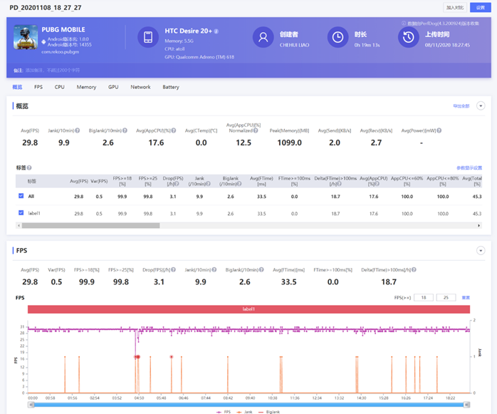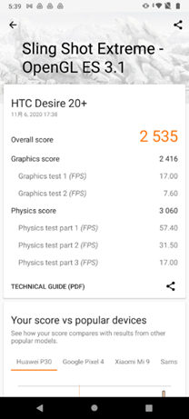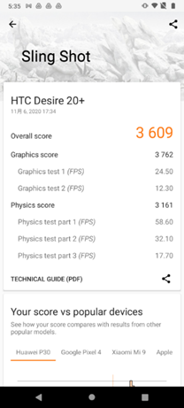 在一局遊戲約 20 分鐘左右,運行平均張數為 29.8 Fps,看記錄線圖張述非常穩定,可以說明顯比採用 S665 處理器的 Desire 20 Pro 順暢,不過當然也可能是由於 HTC Desire 20+ 以螢幕解析度換取更好的順暢度?