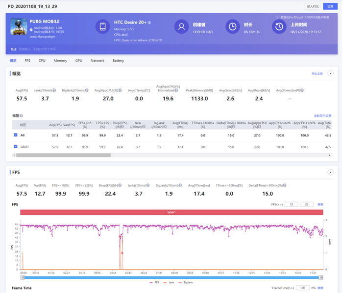 另外也利用 GFX 修改工具,將 PUBG 的 FPS 上限開啟到 60FPS 並開啟高品質模式在重新測試 HTC Desire 20+較高的極限能力