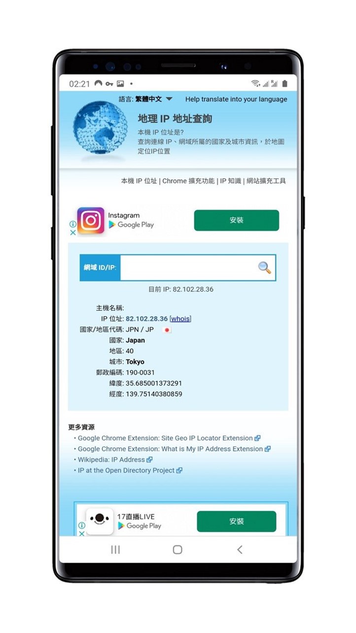 例如阿輝刻意選擇日本伺服器連線後,在到檢測 IP 地址的網站中就會發現偵測阿輝的來源位置已經是日本而不是原本阿輝真正的連線上網 IP 地址了(台灣)