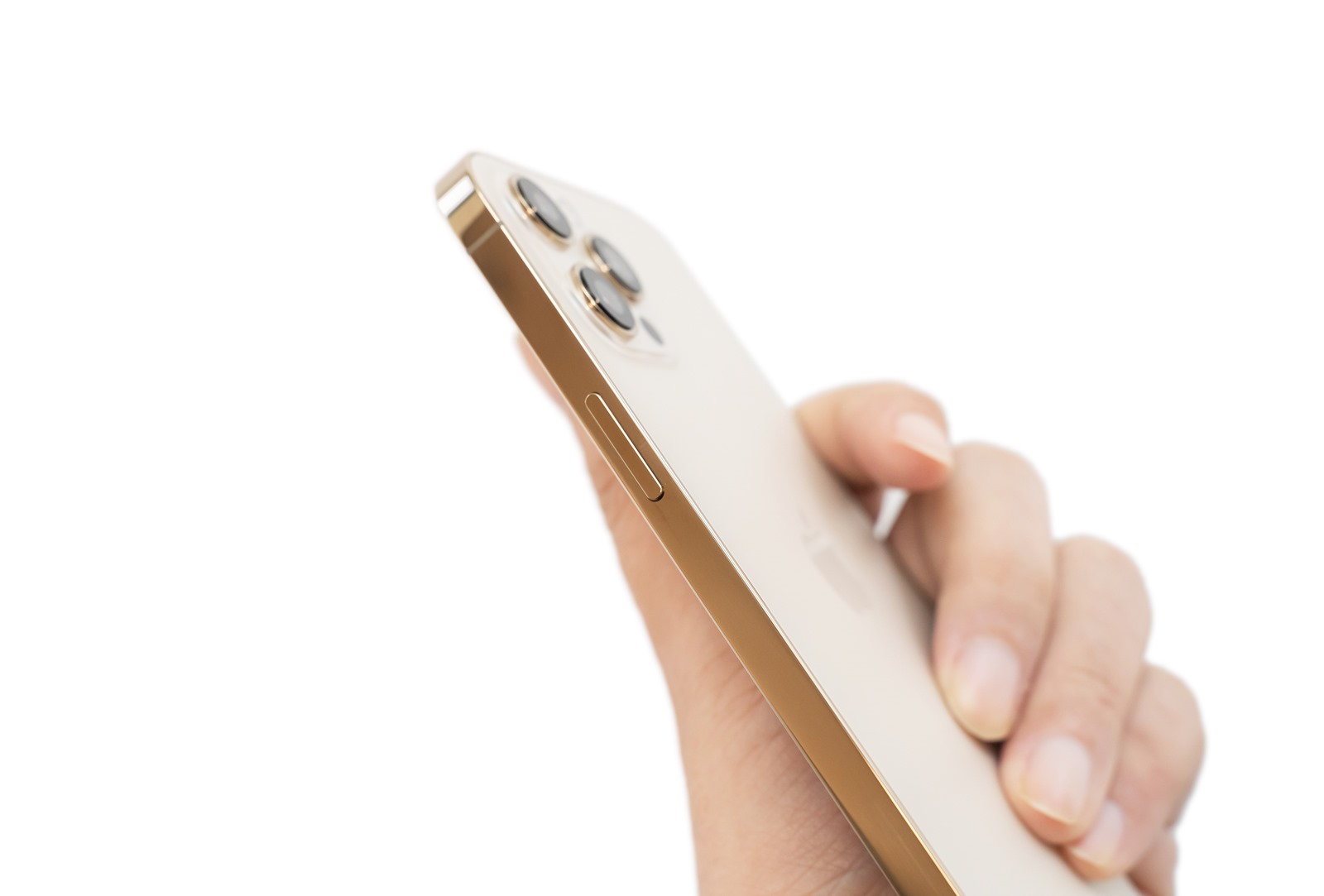 iPhone 12 Pro 採用不繡鋼中框並且為高亮處理的設計,金色要說的話感覺比較像是 iPhone 5 時期的『香檳金』的淡雅感覺