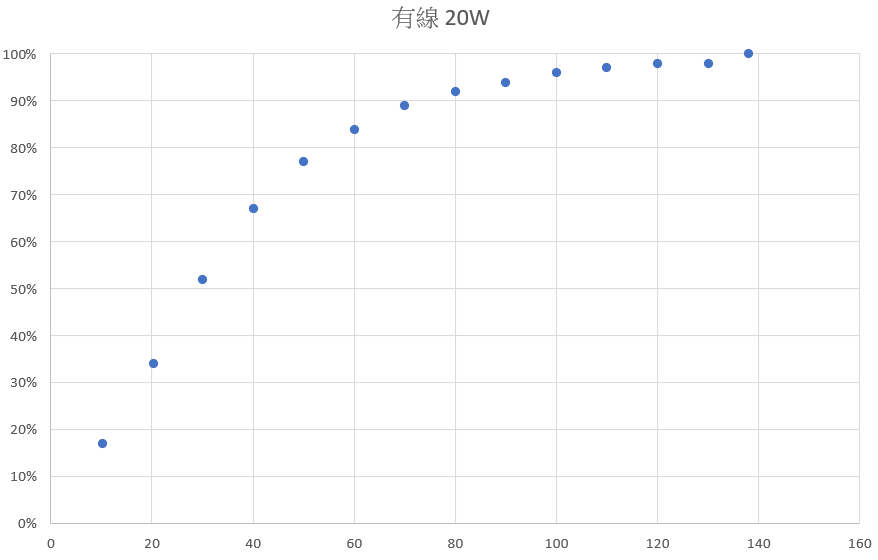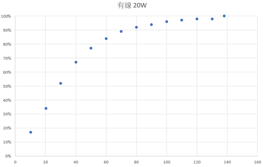 充電部份 iPhone 12 Pro Max 搭配另外購買原廠的 20W 快充,每隔 10 分鐘紀錄充電百分比。