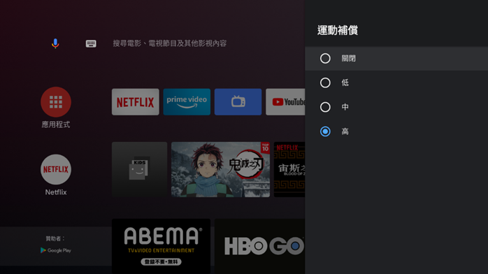 在選單中的『運動補償』選單中可以做開啟,共有低、中、高三段不同的模式可以做選擇,如果是在看玩命關頭這類型較有高速移動畫面的電影或者是看 F1 賽車時,就很適合選擇把模式開到高。