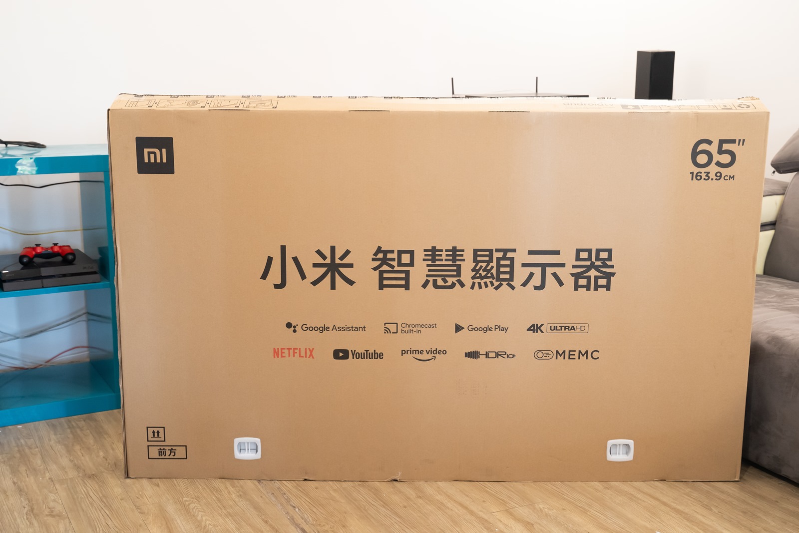 小米智慧顯示器是一款 65 吋型的大型智慧顯示器,從外箱就能顯而易見它的碩大體型、外箱左上角印有小米的 MI LOGO,看到這個 LOGO 就表示這是一個價格甜美的高 CP 值商品;正中央印有這次的商品品名『小米智慧顯示器』,其它的部份則是小米電視的其他特色功能。像是 4K Ultra HD 的顯示畫質、支援 Google Assistant 、內建 Chromecast 、內建的幾個串流影音平台、支援 MEMC 等等。