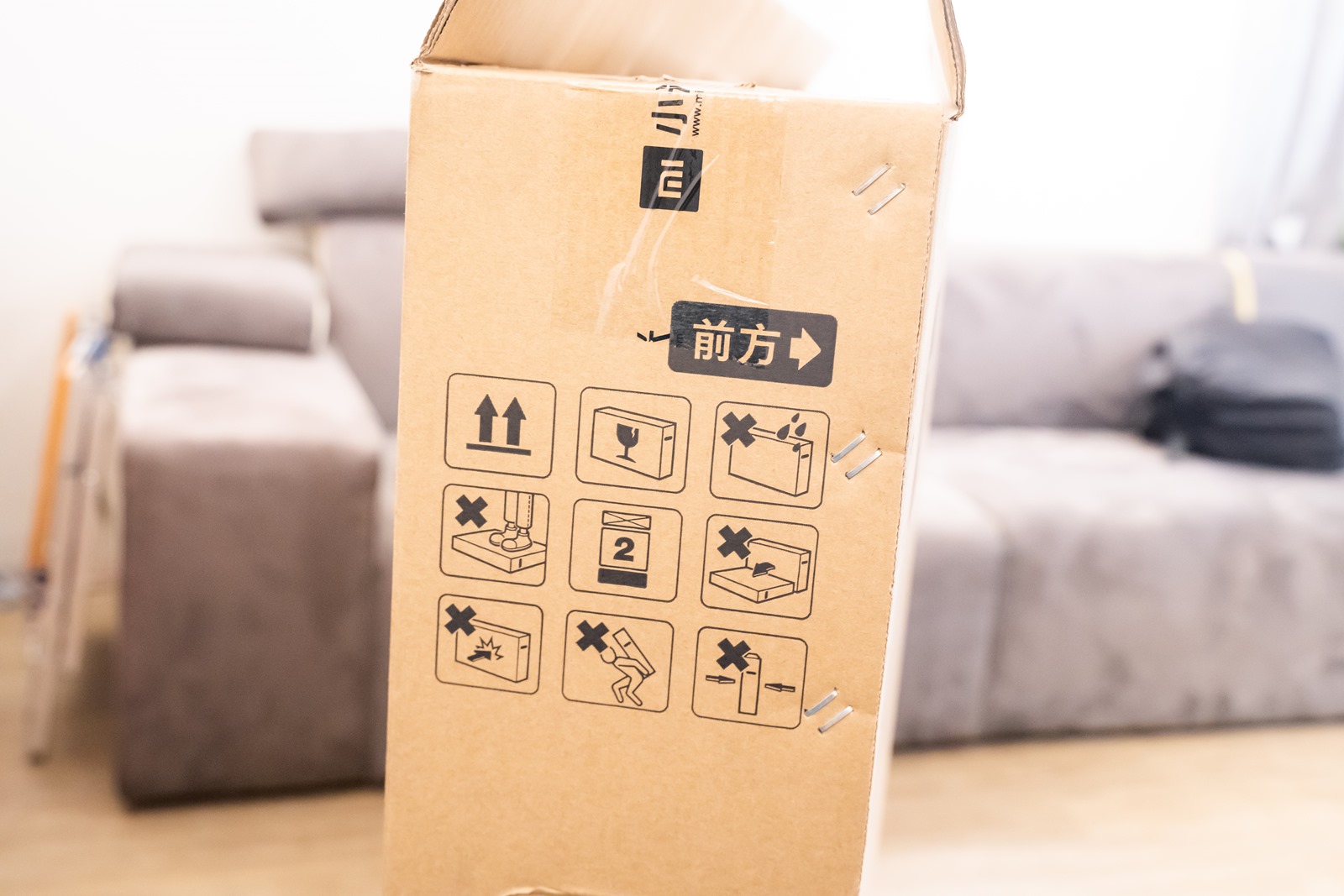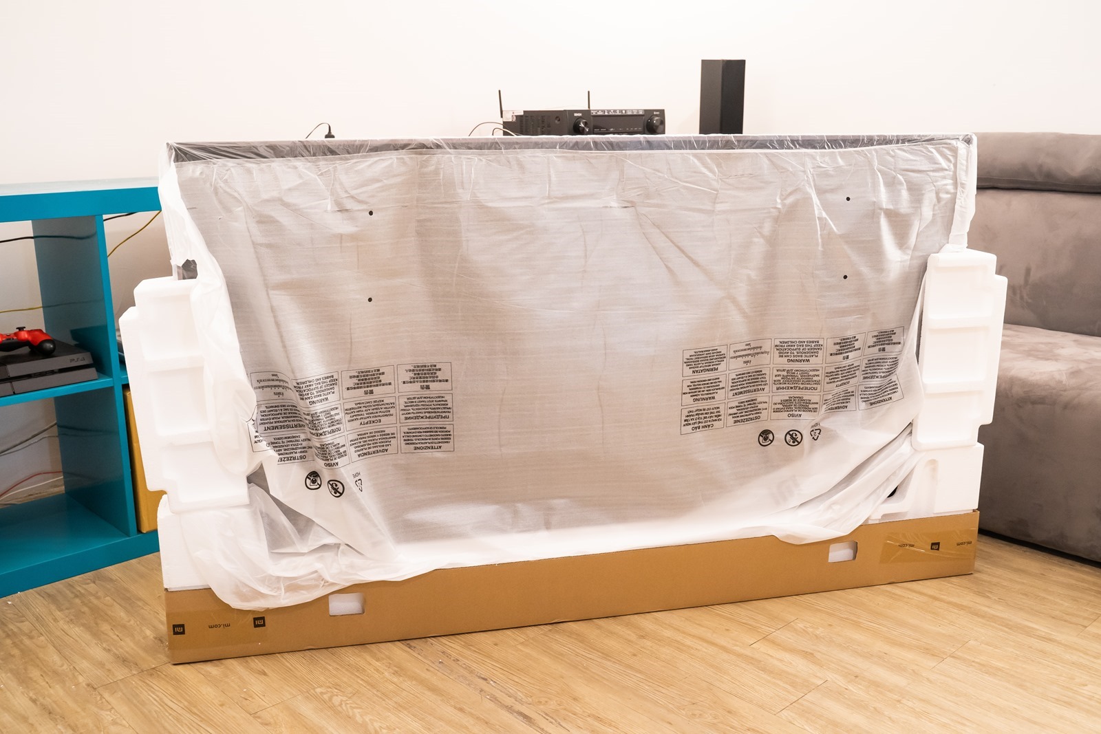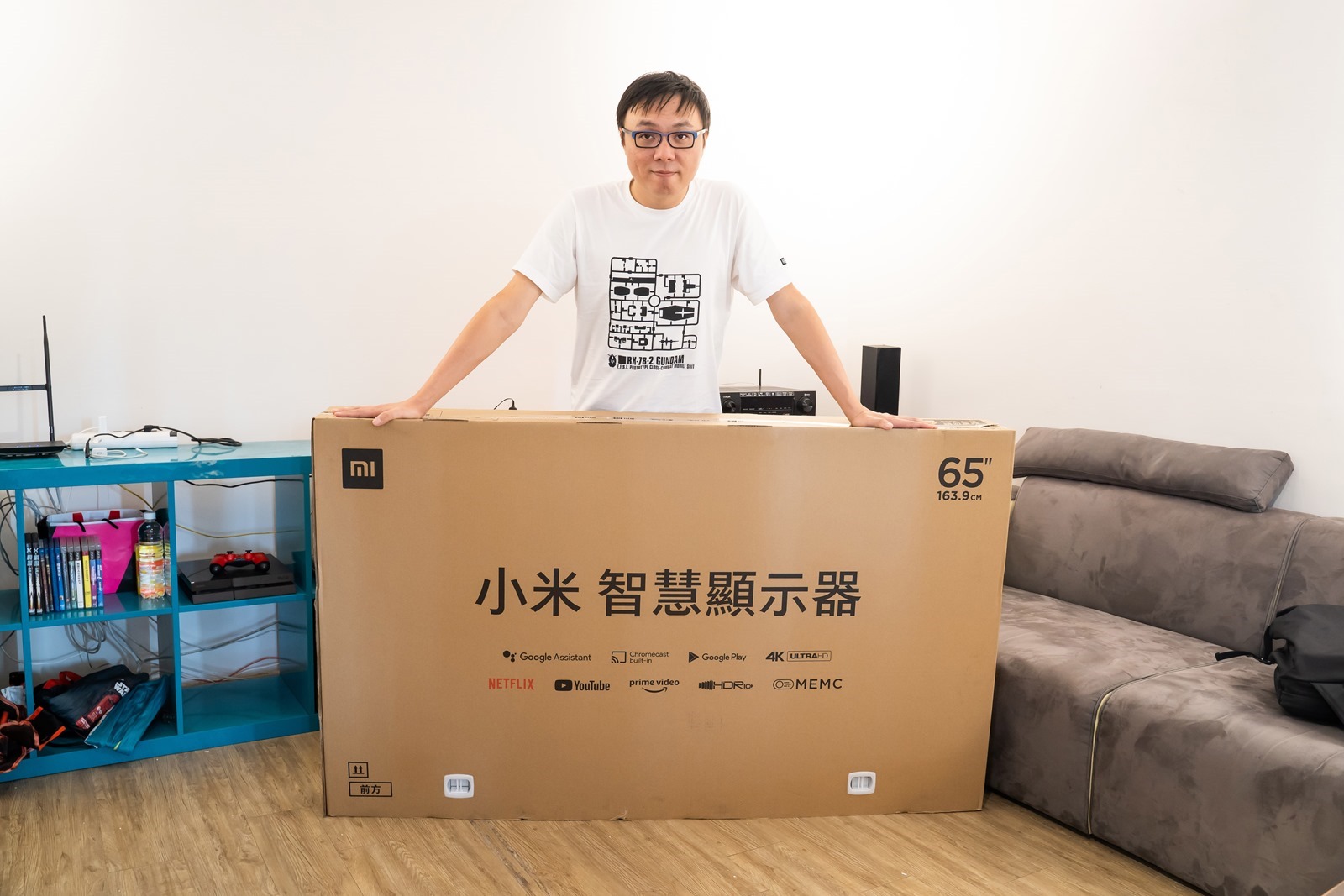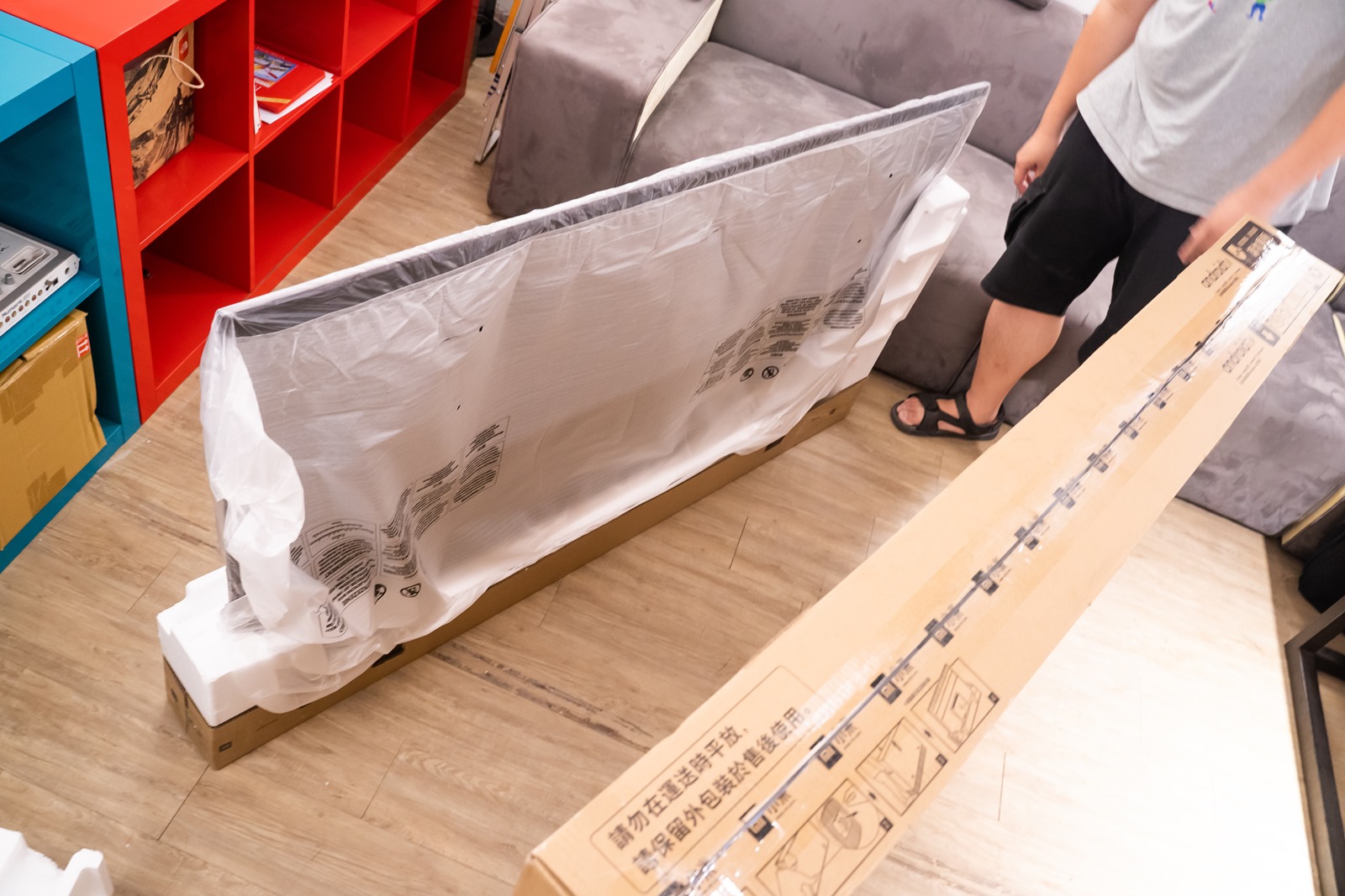 這次阿輝因為要拍開箱照給大家看的關係所以是選擇自行安裝,這麼大的電視安裝,一定要兩個人共同處理才安全,所以也邀請了同行劉胖胖一起和阿輝做開 (苦) 箱 (工);外箱向上拉起後就可以看到小米智慧顯示器啦,固定的包材是大型電視一定有的基本配備:防塵套與保麗龍,穩穩的將電視保護固定好是肯定要的啦。