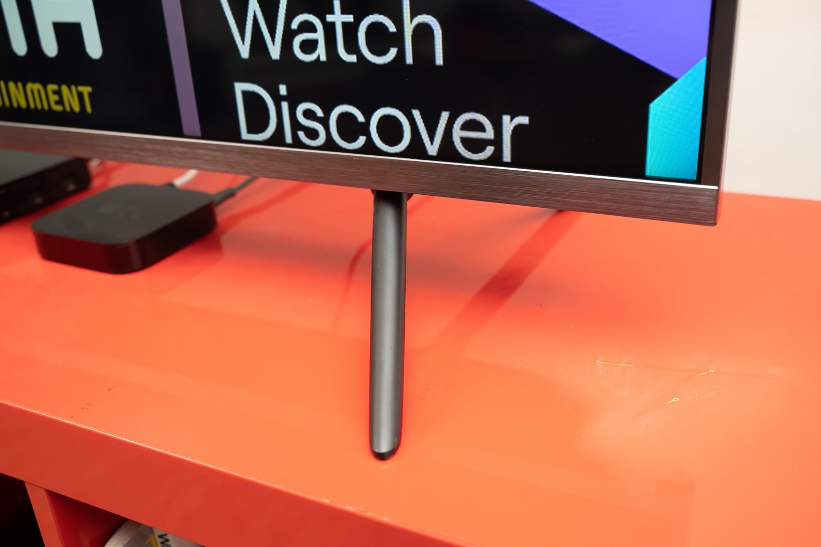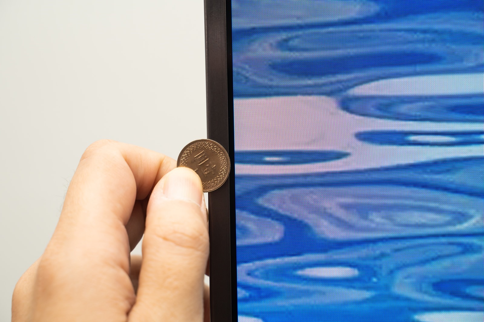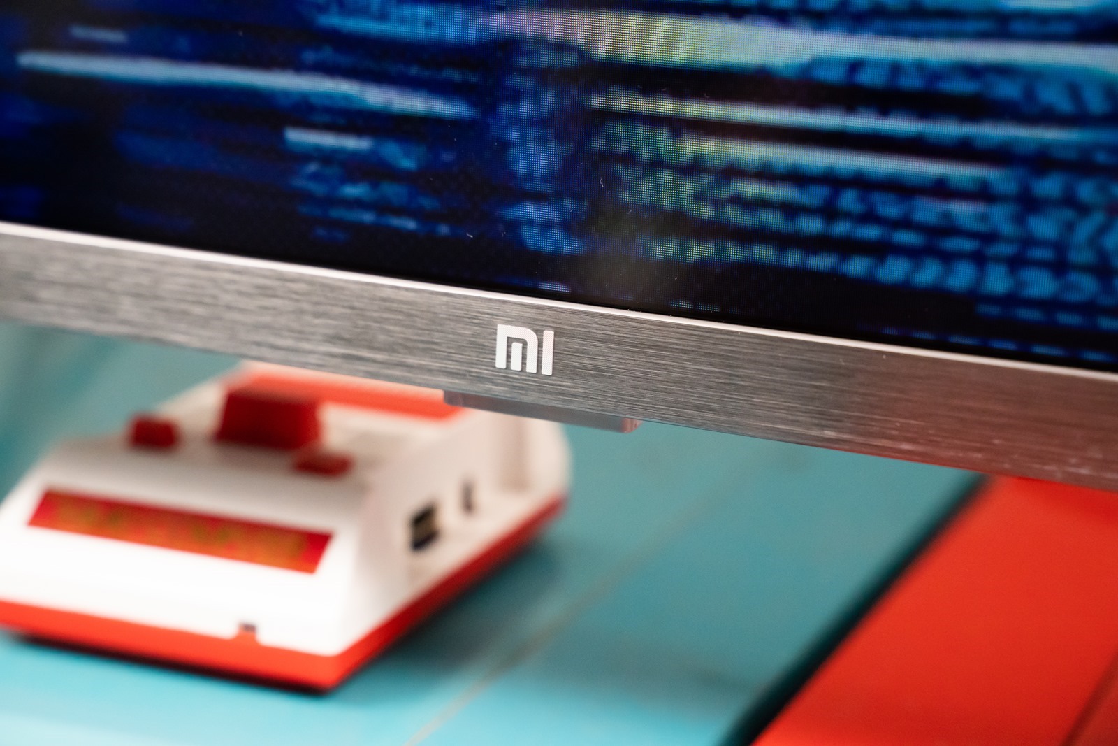 正中央下方也壓印有小米的『MI』LOGO,選用的是白色的材質,在銀色邊框上完全不顯突兀或搶掉電視顯示的風采。邊框的窄度也可說是媲美現在手機的流行製程,能多窄就多窄,連一塊錢硬幣一半的寬度都不到,讓視覺效果更加分,就像一款超大型的滿版手機一樣,給你滿版的觀影感受。
