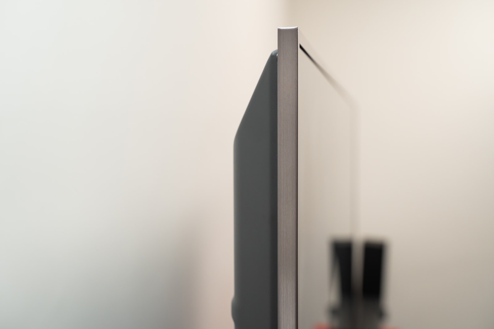 小米電視的邊框表面材質是使用航太級的金屬材質,表面帶有亮麗的金屬髮絲紋,讓簡約的銀色邊框更帶有一些質感層次,其它在這個價位帶的大電視來說,較常會看見的都是塑膠材質的邊框為主,小米在這一點上也可說是誠意十足,沒有因為價格而犧牲掉質感。