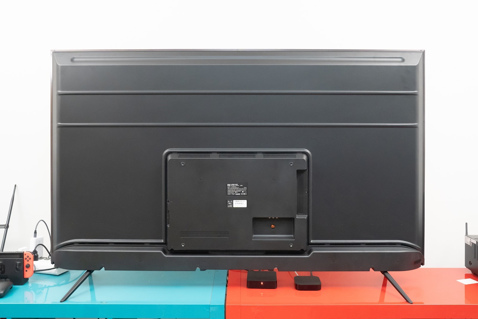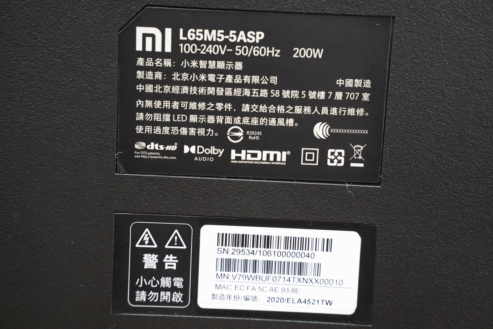 接下來看到電視背面,背板本身沒有做太多特別的設計,除了可以看到支援壁掛的開孔以外,正中央小盒子就是裝有 64 位元四核心處理器的裝置、記憶體的規格則是 2GB+16GB,剩下的就是揚聲器和連接埠。貼紙上則顯示有小米智慧顯示器的型號和各項資訊,電力部份是通用 100-240V~ 50/60Hz 。能夠帶給你劇院級音效體驗的發聲元件也是在這個區域,共有四個強大的音效驅動元件組成一組 20W 功率的杜比立體聲喇叭、並配備有 30mmX100mm 的跑道式低音喇叭與 16mm 的球形高音發聲單元,讓小米智慧顯示器的聲音聽起來帶有豐富的高低音層次。