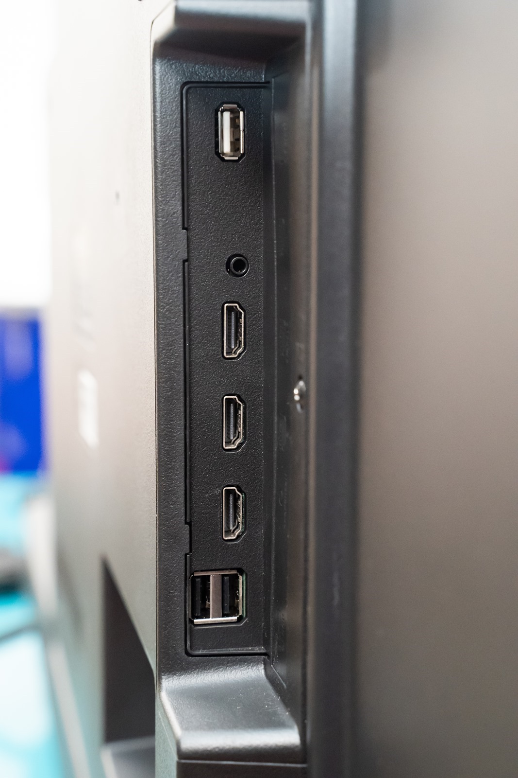 連接埠的部份在電視面板左側共有 3 個 HDMI,其中一個 HDMI 支援 ARC 功能,內建設定是 HDMI2 支援 ARC,ARC (Audio Return Channel)功能主要就是可以方便連接到擴大機使用,不需要在額外使用音源或是光纖線材連接;另外還有 3 個 USB 2.0 和一個 3.5mm 音源線的耳機孔。