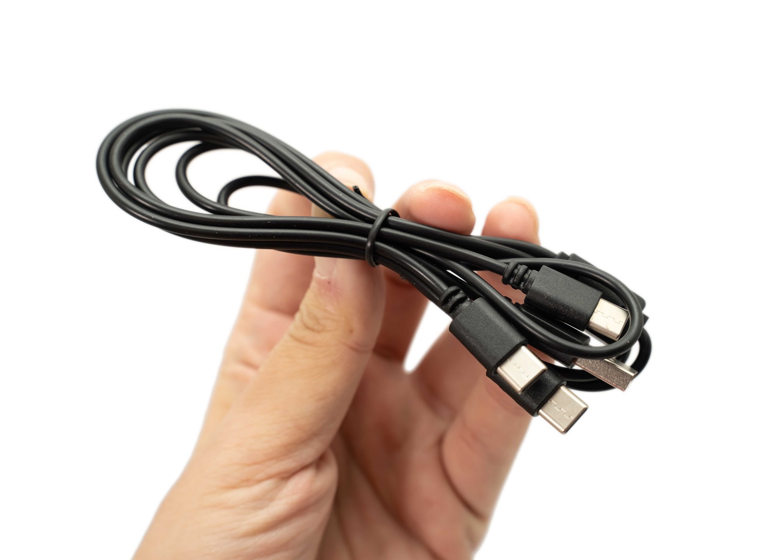 包裝中直接有附上相機與手機用的線材、一對三的 USB C 充電線材