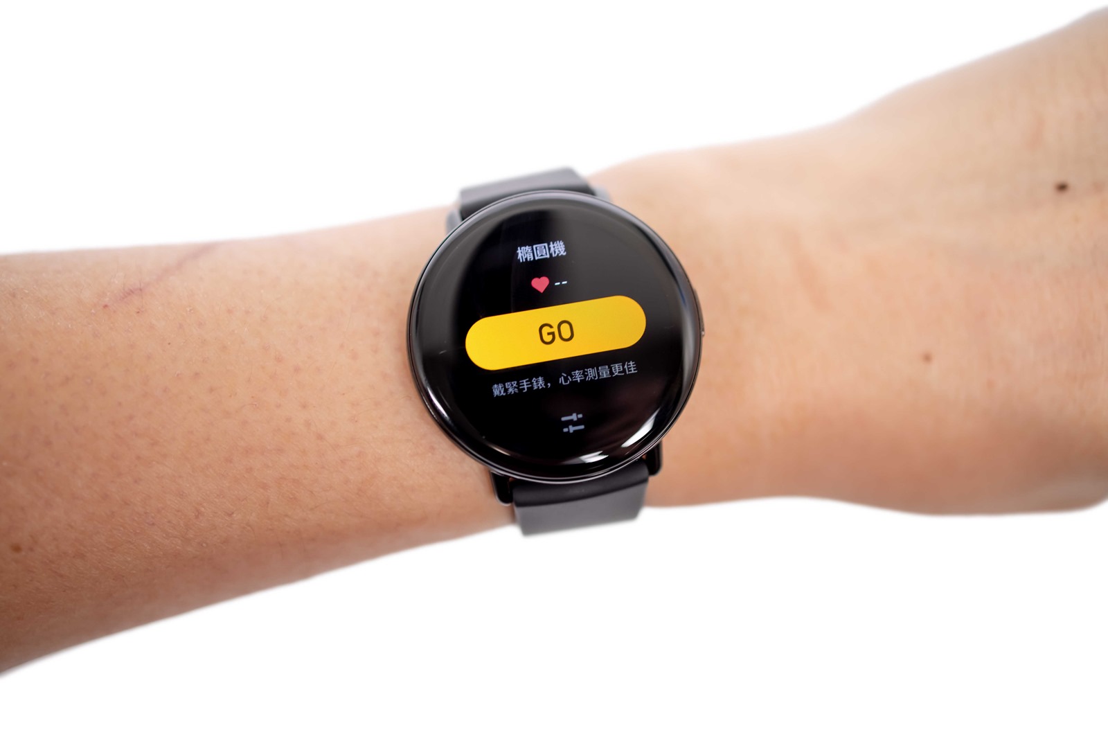 想要使用運動模式也非常簡單,只要點進去即可看到準備開始的介面,上面會顯示使用者選擇的模式,中間的紅心則是心律,大大的 GO 一按下去就可以開始運動。