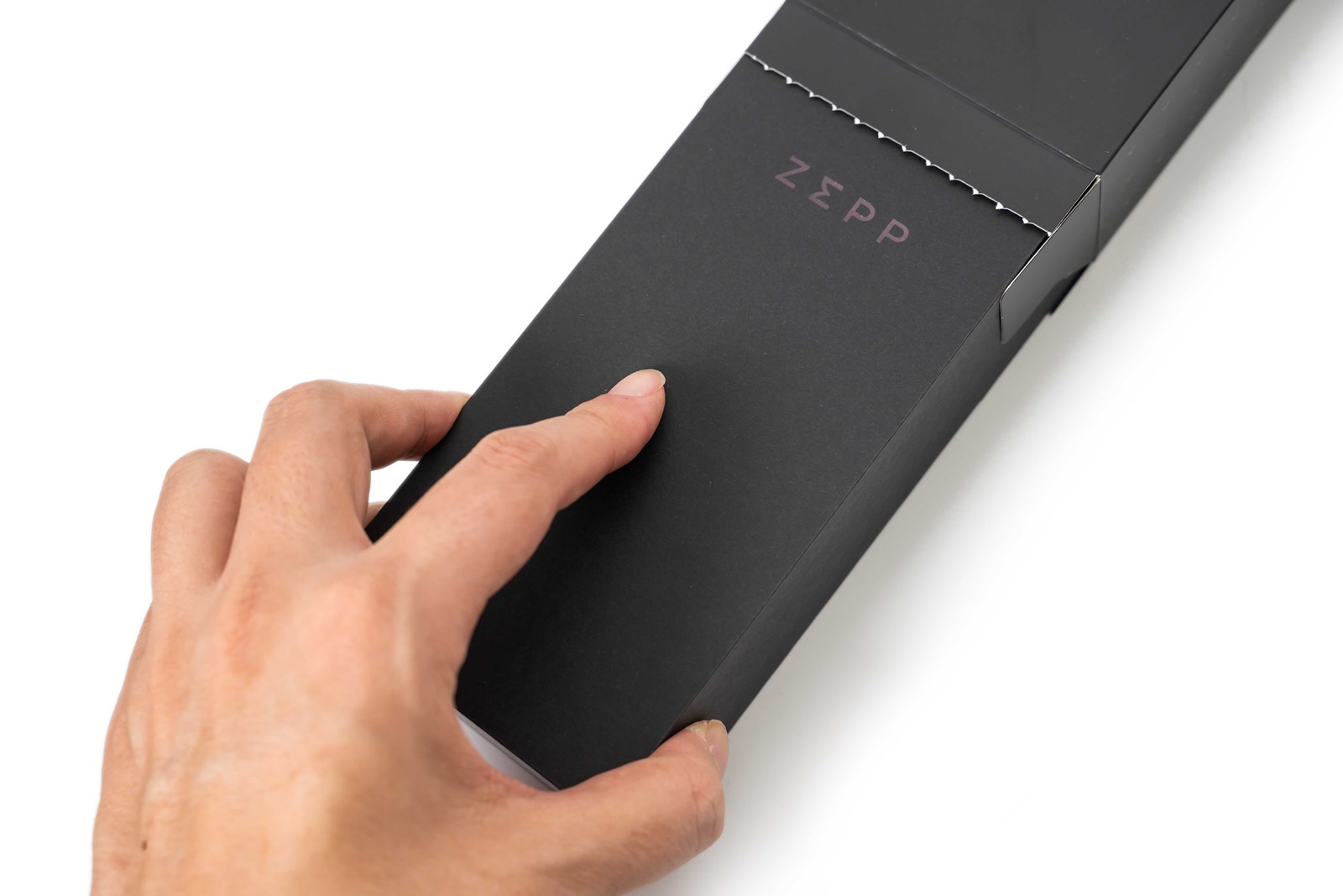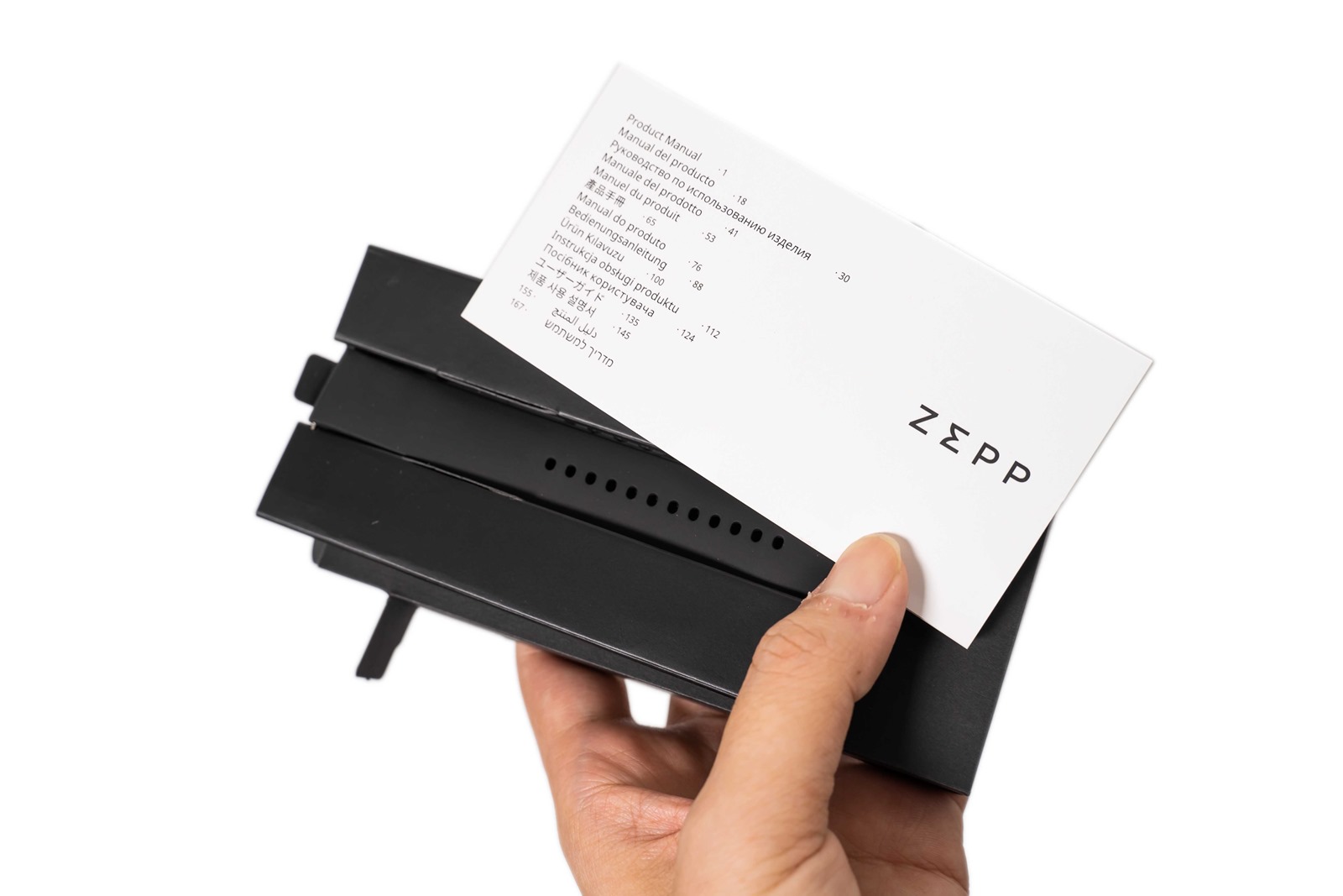 Zepp E 從外盒開始就絕美,這件事情絕對不容質疑,收到的時候讓人相當驚喜,幾乎全黑的長方形盒子,材質非常厚實不容易受重擊損傷也是能保持從內而外完美的原因之一。包裝盒正面有 Zepp E 的玉照,鏡面圓滑的表面設計用閃耀的局部光設計表現,摸起來來有凹凸感,不只能顯現出表面的鏡面質感、弧形表身設計,同時也看得出閃耀光澤與質感。
