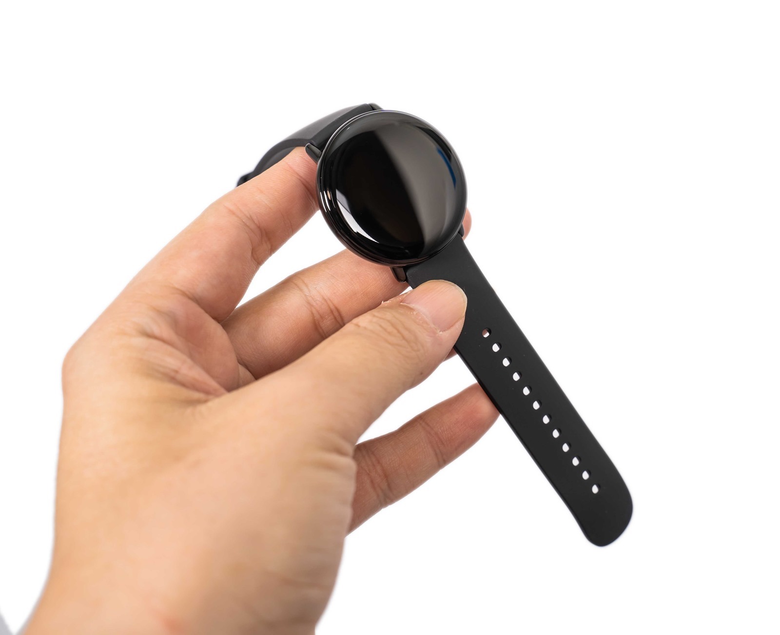 無論怎麼反轉它都是一個完美的扁身正圓形,精雕細琢的黑色弧面無邊框玻璃設計,讓整個表面質感像是來自未來的某種晶體,或是 Star Trek 上面才有的高科技產物,精緻平滑、毫無死角的美感,弧形的線條接近完美。