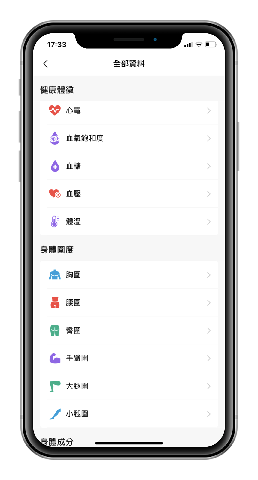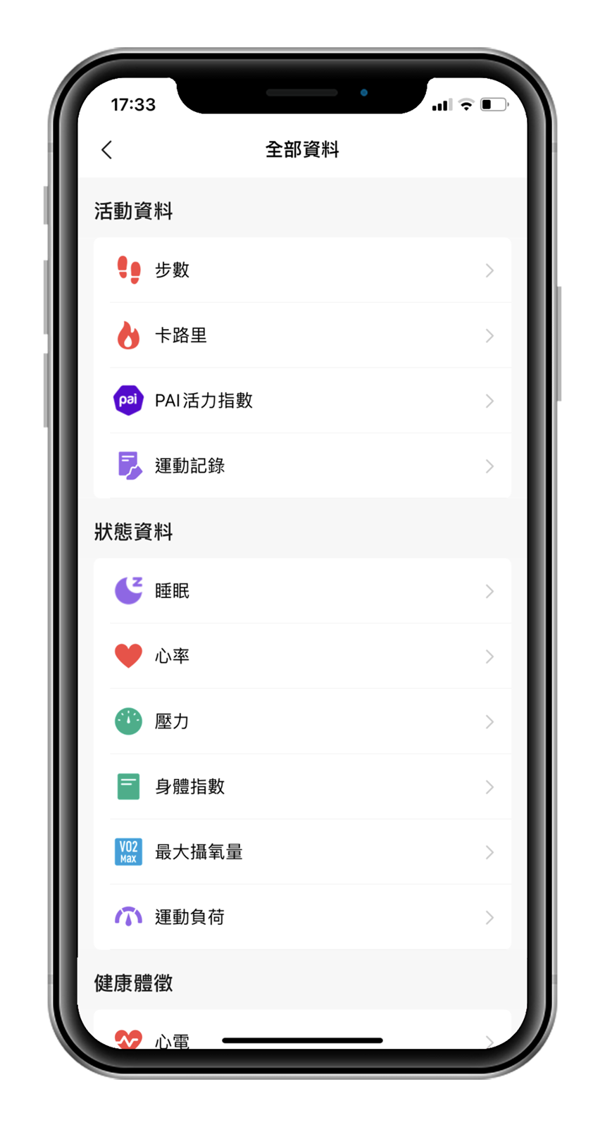 接著快速看過導覽之後,就可以開始使用 APP 了!使用非常直覺,基本上所有基礎訊息都在基本介面上,而右上方的田字型圖案按下去就可以進入更豐富的全部資料。全部資料中有的是可以透過 Zepp E 記錄的,有的是要靠自己鍵入,畢竟手錶再強都不可能知道使用者身高幾公分吧?