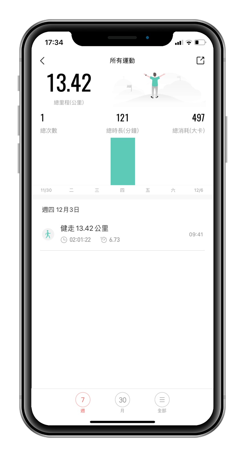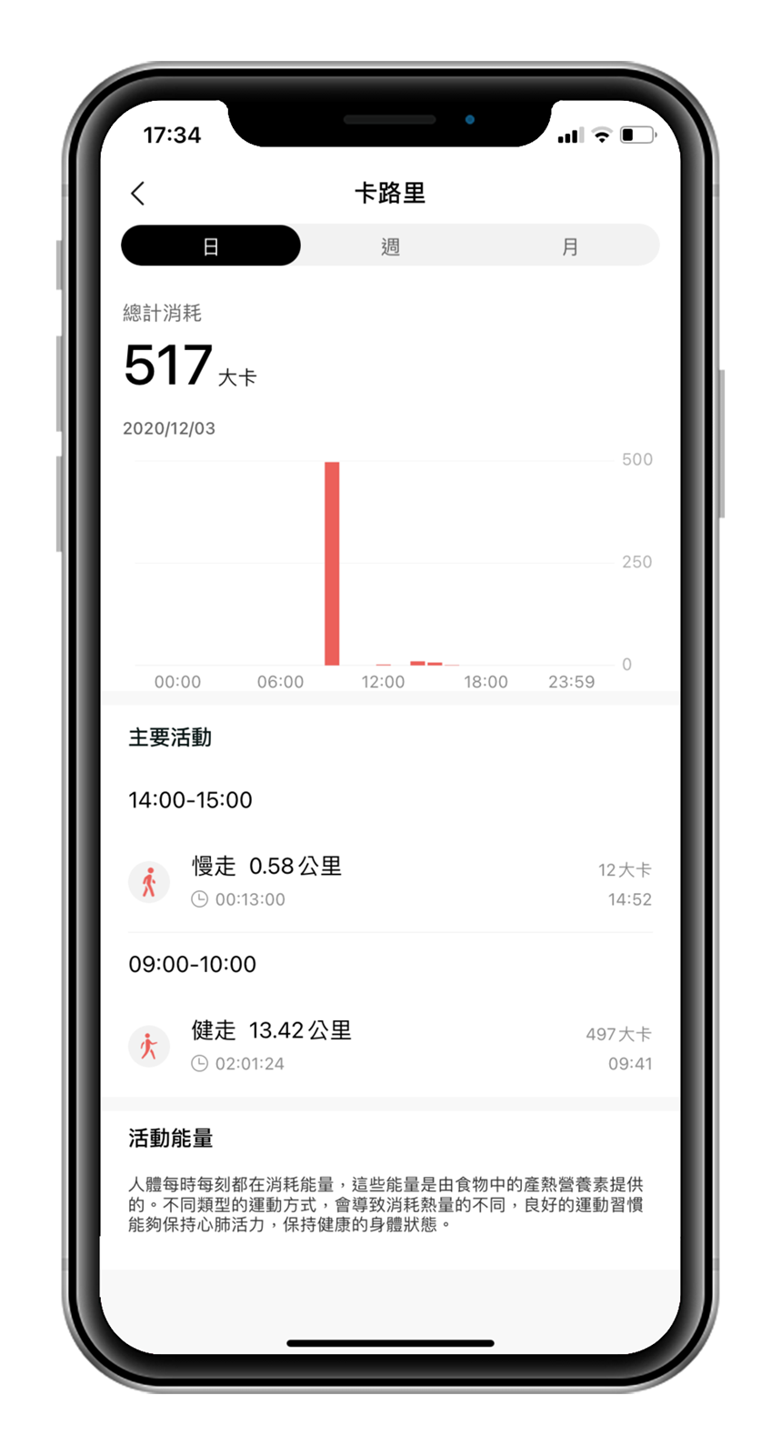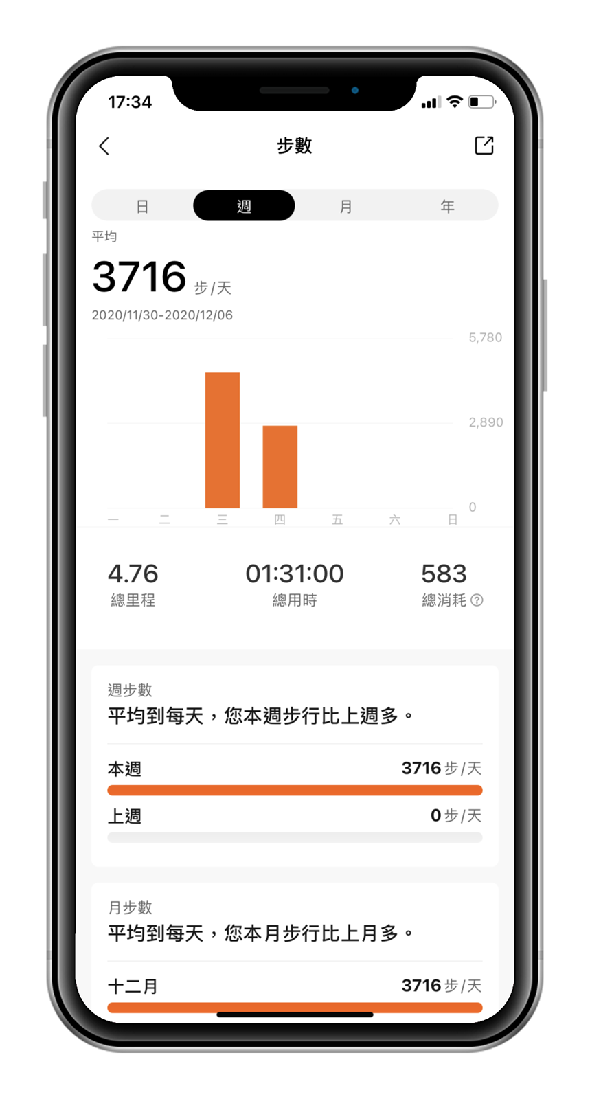所有的身體數值都可以透過 APP 記錄與確認,每日目標、步數或是消耗卡路里透過簡單介面都一目了然,也可以用週或是月份為單位來檢視自己的運動狀況。
