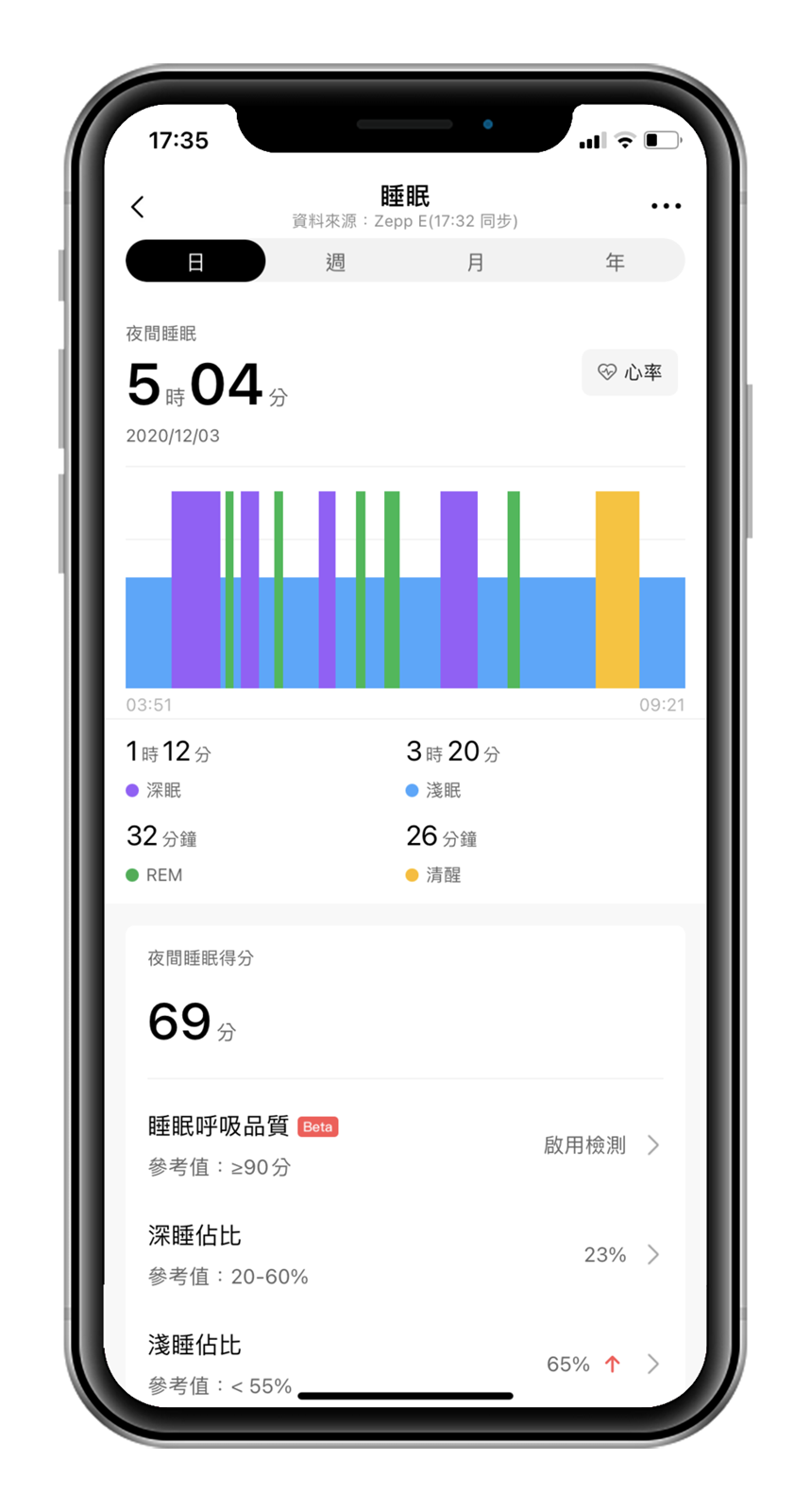 當然,也能記錄睡眠;比起 AppleWatch,Zepp E 比較優異的地方在於強悍的續航力,它能稱至少一週,所以表示至少可以記錄一整週的睡眠狀態,不用擔心得在睡覺時把它拿下來充電,讓睡眠記錄與分析功能形同虛設。基本上簡單基礎的睡眠資訊在 APP 首頁就看得到,且透過 APP 的睡眠監測功能專區可以知道自己在淺眠、深睡、快速動眼時期 REM 的情況,並且給一個睡眠品質的總分,很直覺方便、容易閱讀,觀察睡眠狀態同時也能透過這些資料整理,提升睡眠品質。