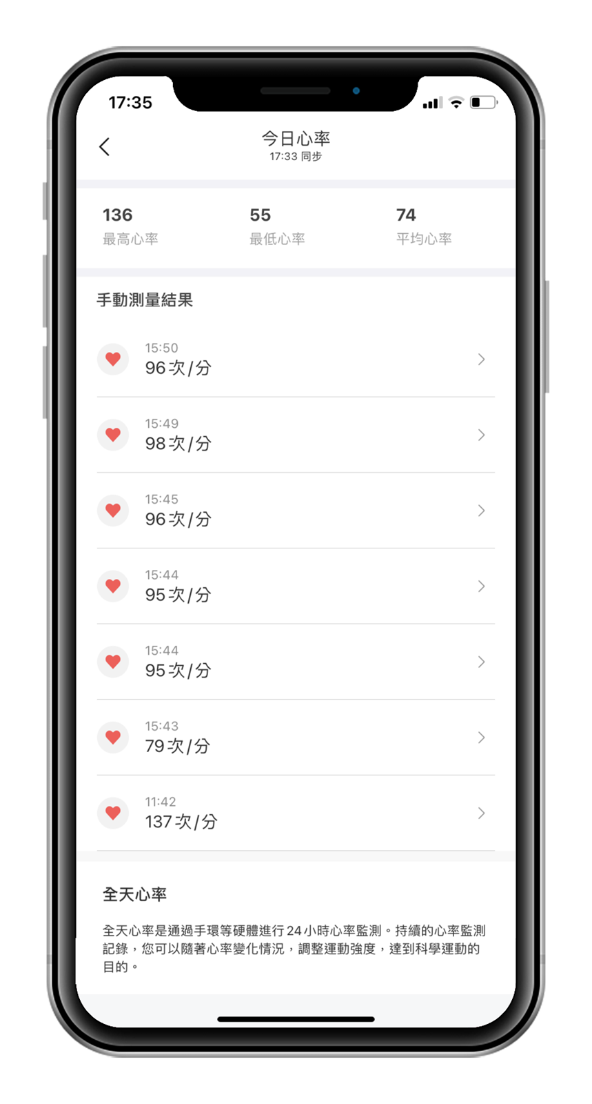 Zepp E 記錄的心律也能用 APP 做整合,一次檢視所有跟心律有關的資訊,像是平均心律、手動測試數字,還有靜態心律與動態心律等等。