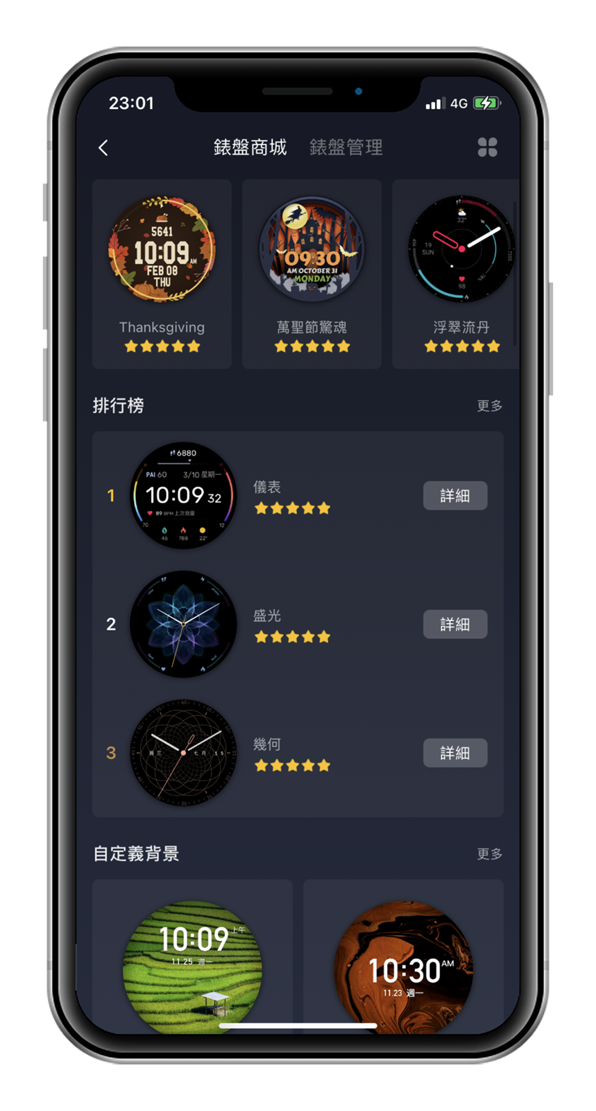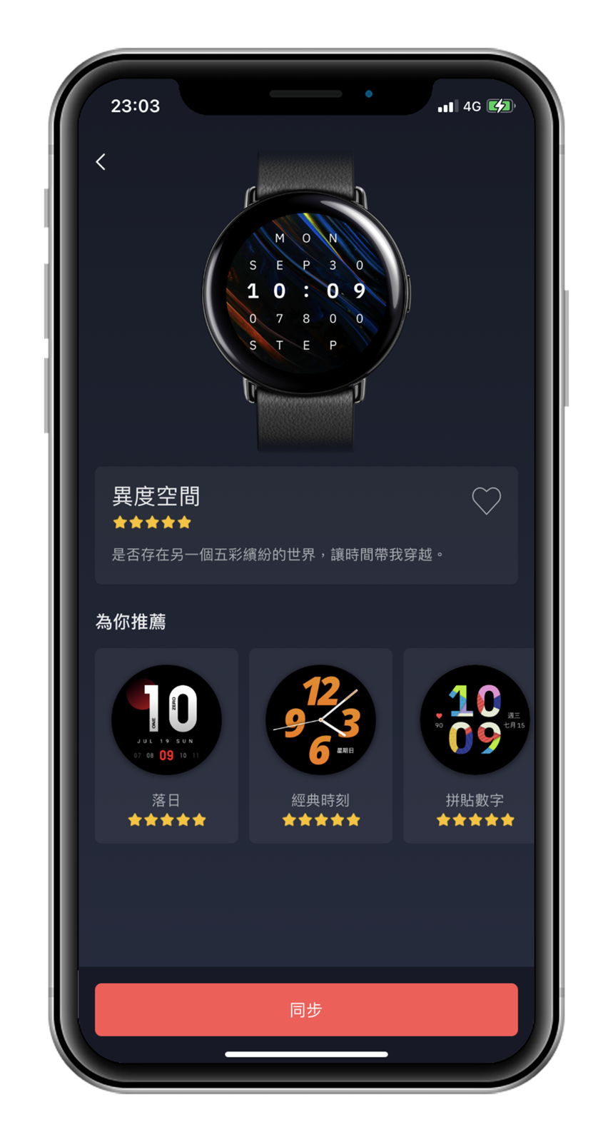 除了五種內建錶盤外,也能透過 Zepp 應用程式下載更多線上錶面、用以彰顯個人風格的不同設計!只要進入手機 APP 後選擇錶盤商城,然後選擇喜歡的點進去,就可以看到同步按鈕。