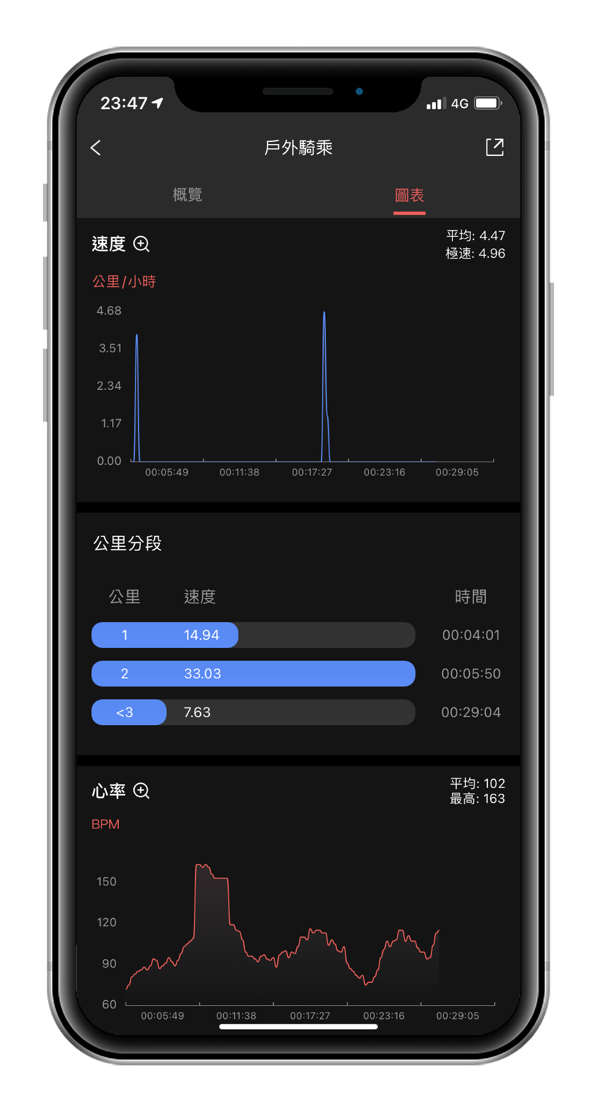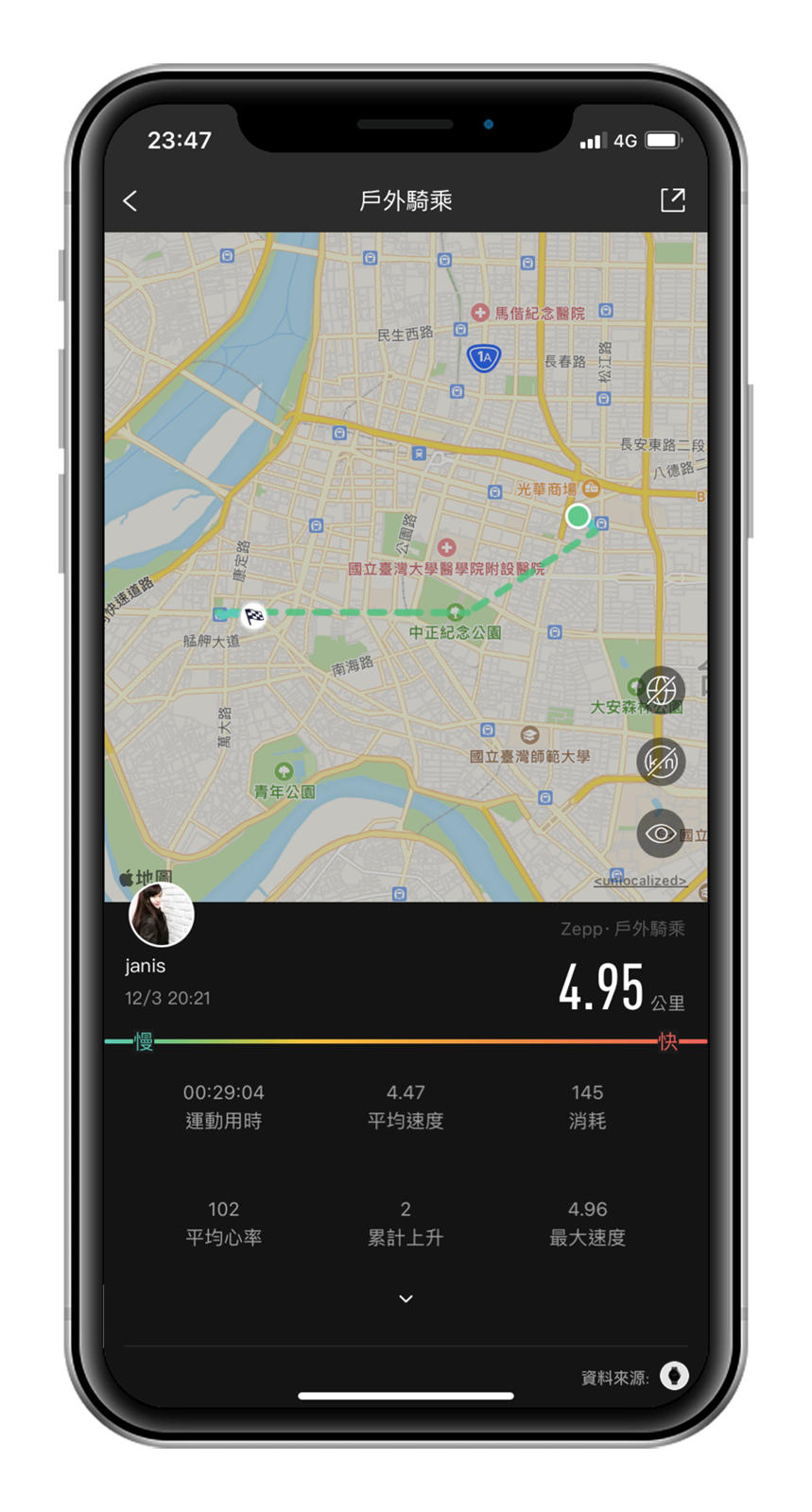 只要資訊設定得越多、完成的檢測與運動越多,介面首頁出現的資訊也會隨之增加,而想要針對某些特定項目知道得更詳細,只要點進 APP 的該則項目即可;比方說想要知道『騎乘』的更多資訊,只要點進去就可以看見 GPS 位置或是其他像是平均速度、運動過程中的心律狀態之類的相關內容。
