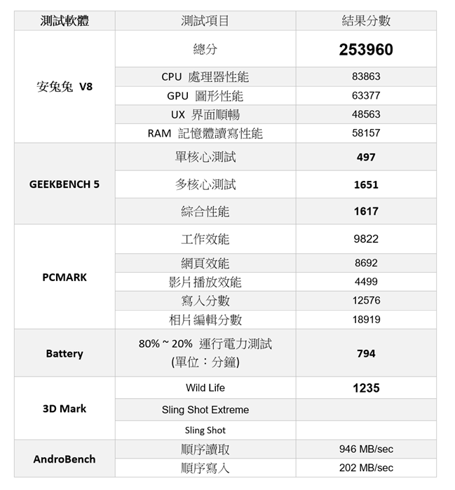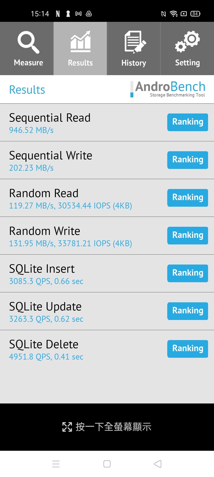 其實除了 CPU 處理器與記憶體,內建儲存空間的讀取/寫入速度也非常影響到日常使用的順暢度,這裡使用 AndroBench 實測讀寫速度,測得的結果為讀取 946 MB/sec MB,寫入為 202 MB/sec
