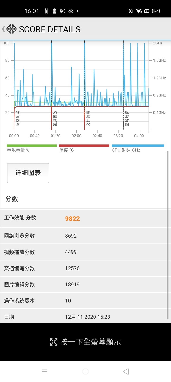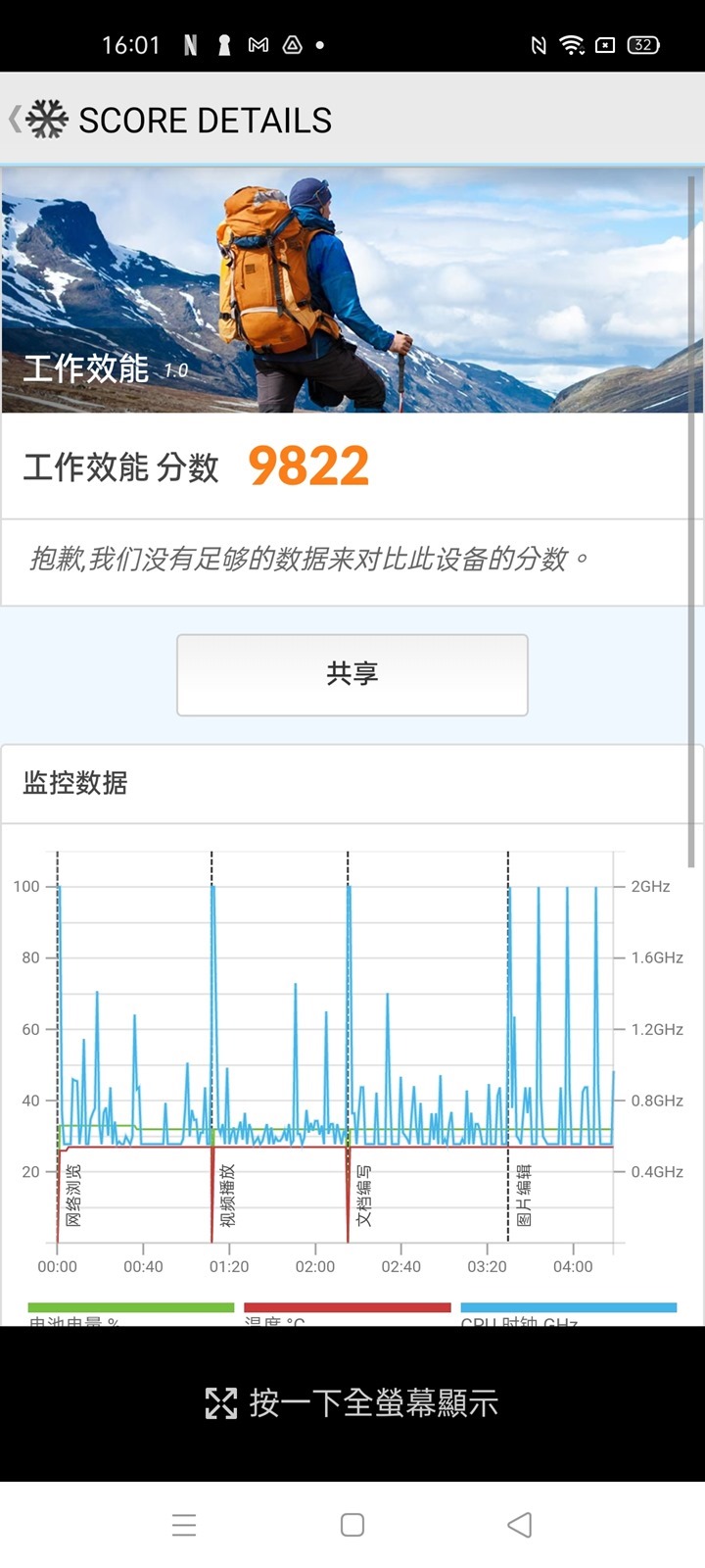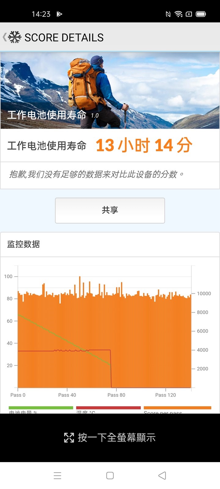 阿輝實際測試 A73 內建電池容量為 4040 mAh,實測電力部分以 PCMARK 做標準測試,測試 80% ~ 20% 間的電力運行,模擬上網、工作、遊戲的混合應用,測試結果為 13 小時 14 分鐘,測試方式與標準可以參考這篇說明。