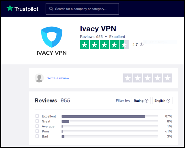 4.7 / 5 TrustPilot 評分(這是客戶對Ivacy VPN的信任程度)所有評論均為 100%原始且都可經得起考驗,有 87% 的使用者感受良好,相信阿輝我也不是會亂推坑給各位的。