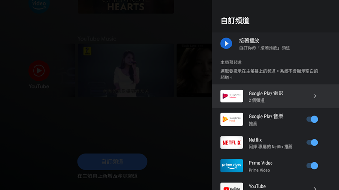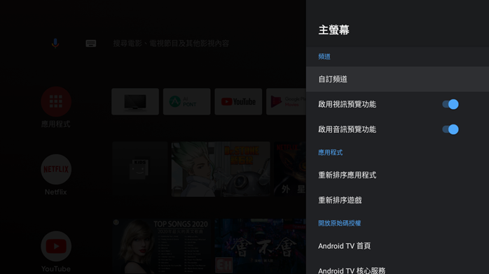 主螢幕設定裡可以自行調整自訂頻道和應用程式及遊戲的排序,是否要啟用視訊、音訊的預覽功能也可以在同一個地方做開啟或關閉。