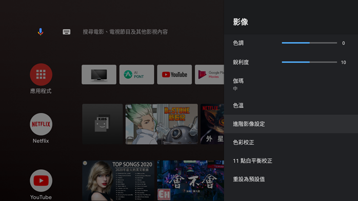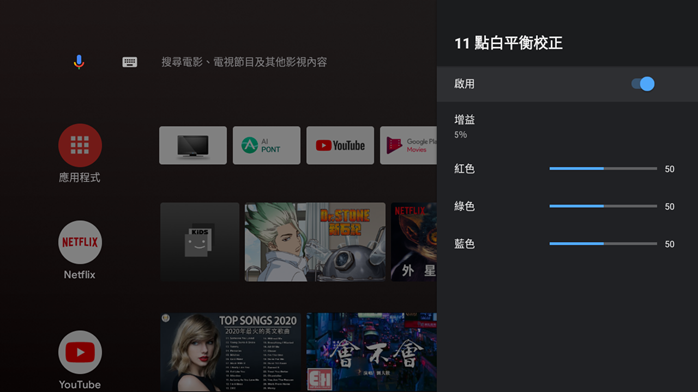 色彩校正和 11 點白平衡校正的功能也都不缺,雖然價格便宜但是可以調整的功能非常完整,甚至許多貴上不少的他牌智慧電視功能都還比較少。