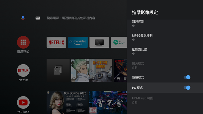 進階影像設定裡面也可以開啟遊戲模式,讓遊戲的視覺效果更佳優化。若將螢幕拿來當做電腦顯示器使用的話也可以打開 PC 模式,讓手中的筆電可以再多加一個電視螢幕出來,雙螢幕處理文書事宜或多工需求都很方便。